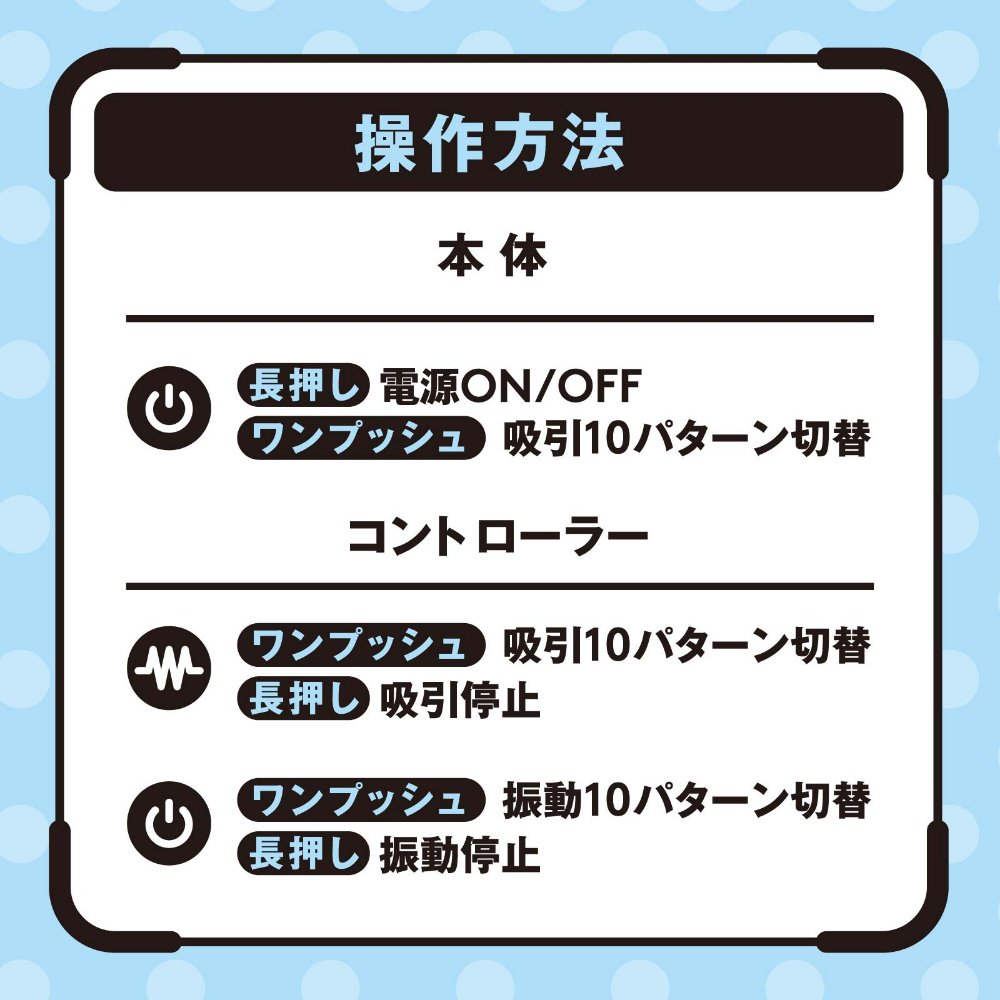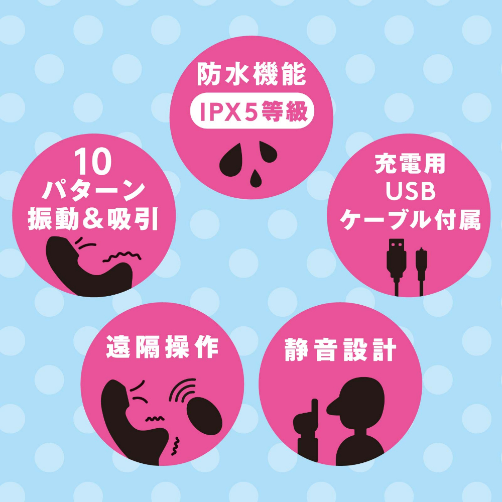 場所やシチュエーションを問わずに使えるストリートローターシリーズから吸引タイプが登場。手のひらにのる小さいサイズながらもしっかりと吸ってくれる吸引機能、盛り上がった山は入り口を振動で刺激してくれます。股に挟んで使える設計と遠隔で操作できるリモコン付きなので、1人でもお外でも満足のいくプレイを楽しめます。パンツに固定できるマグネット付きで、ズレてイイところに当たらない、なんてこともありません。※本体:充電時間約90分※本体:最大連続稼働時間約50分(初期振動パターン未変更時)_防水機能IPX5等級_10パターン吸引_10パターン振動_付属品:電池式リモコン、USBマグネット式充電ケーブル