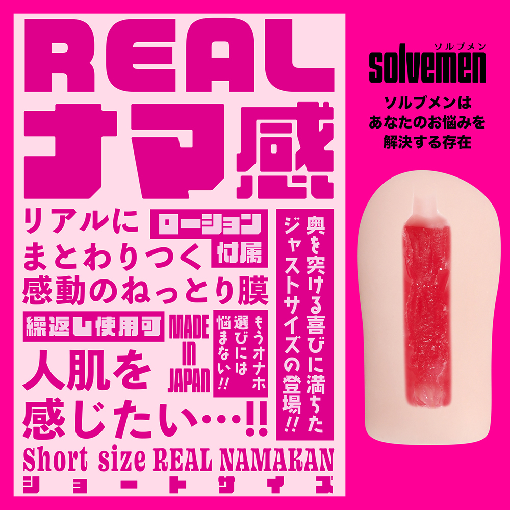 ソルブメンはあなたのお悩みを解決する存在です。「ショートサイズ REALナマ感」は短くても楽しめるお悩み解決ホール。奥に簡単に到達できるのが自慢です。人肌素材のリアル二層弾力で快感のバランス抜群に良く包み込みます。この喜びを知ったらもう普通のホールには戻れません。あなたはオナホ選びに悩む必要はなくなります。あなたのためにソルブメンがいるのです。安心安全の日本製で繰り返し何度でも利用が可能です。