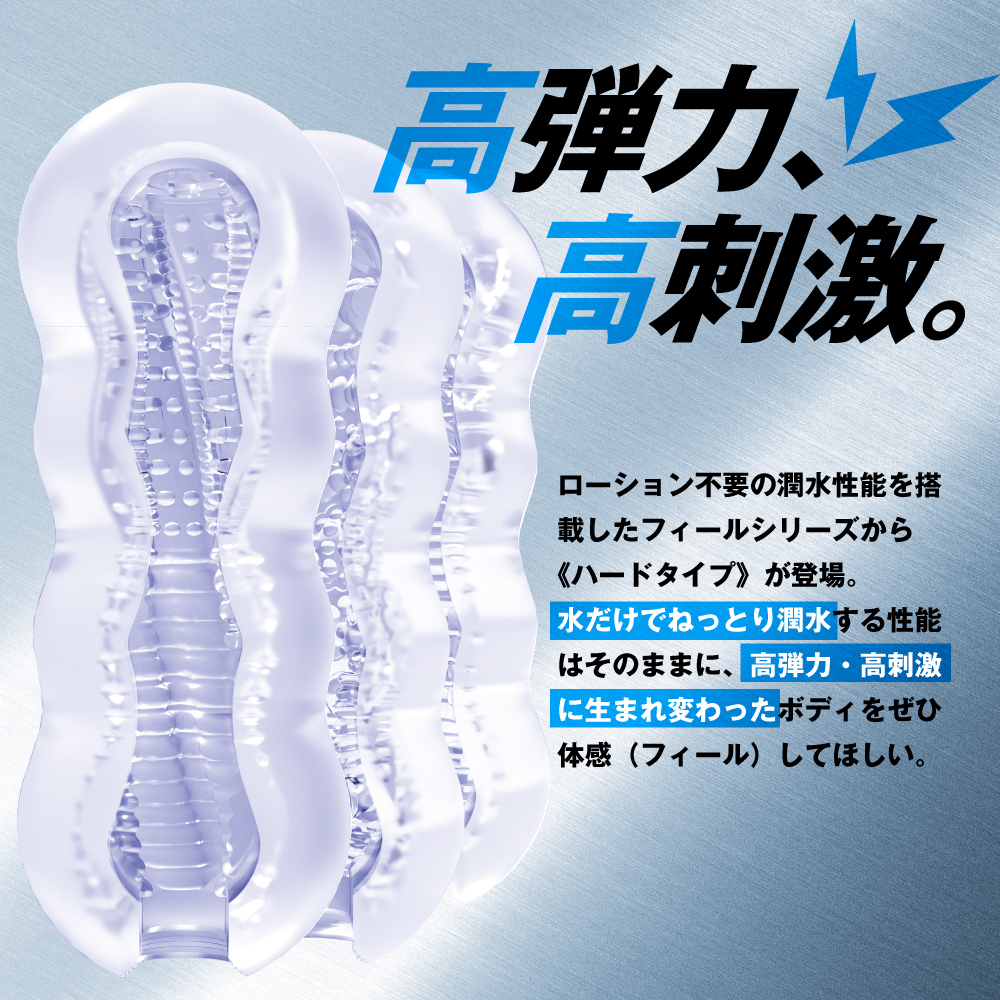 待望のハードタイプが誕生!くっきりとした刺激とパワフルな反発力。絡みまとわりつく2つのエリアが楽しめるループタイプ。フィールシリーズから遂にハードタイプが誕生!ストロークするたびに手まで伝わる振動は圧巻。ハードタイプも全種類プラスウェッチ素材。水をつけるとねっとり潤い、包み込むようなテクスチャーが特徴。ループ【非貫通タイプ】はエッジの効いたループと弾力のあるループを全体に配置。絡みまとわりつく2つのエリアのコントラストが1度に楽しめる内部構造。ハード素材による反発力で弾ける様な触感をぜひお試しください。予備ローション付き。