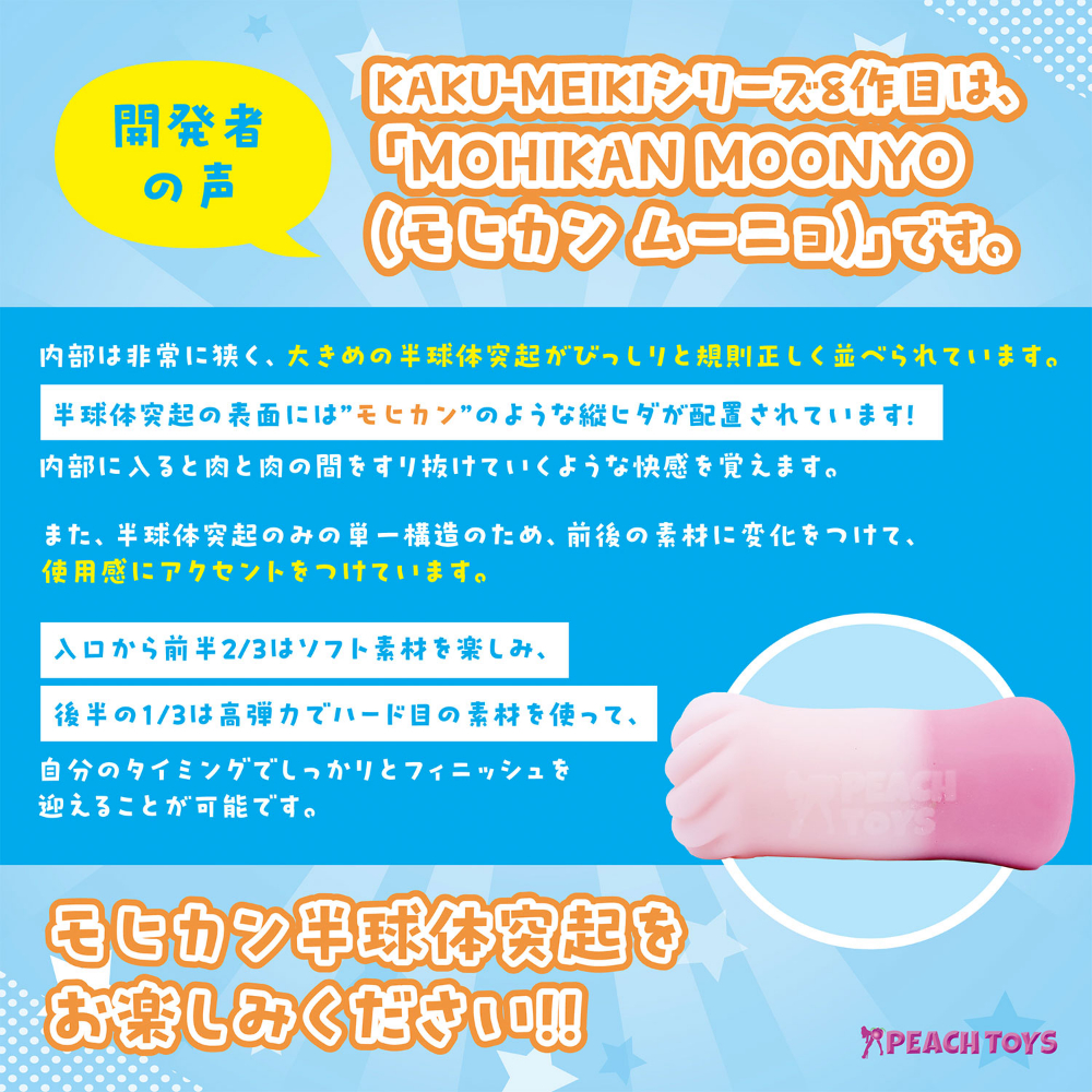 『モチモチソフトで優しい感触♪28個の半球体がびっしり!!ソフトな巨大突起を潜り抜けろ!』KAKU-MEIKIシリーズ8作目「MOHIKANMOONYO(モヒカンムーニョ)」の登場です。内部は非常に狭く、大きめのやわらか半球体突起がびっしりと規則正しく並べられています。半球体突起の表面にはモヒカン"のような縦ヒダが配置されており、内部に入ると肉と肉の間をすり抜けていくような快感を覚えます。また、半球体突起のみの単一構造のため、前後の素材に変化をつけて、使用感にアクセントをつけています。入口から前半2/3はソフト素材を楽しみ、後半の1/3は高弾力でハード目の素材を使って、自分のタイミングでしっかりとフィニッシュを迎えることが可能です。『手前で感じて奥でフィニッシュ!ニュル感抜群!無限に動きたい衝動!こみ上げる快感!』モヒカン半球体突起をお楽しみください!!