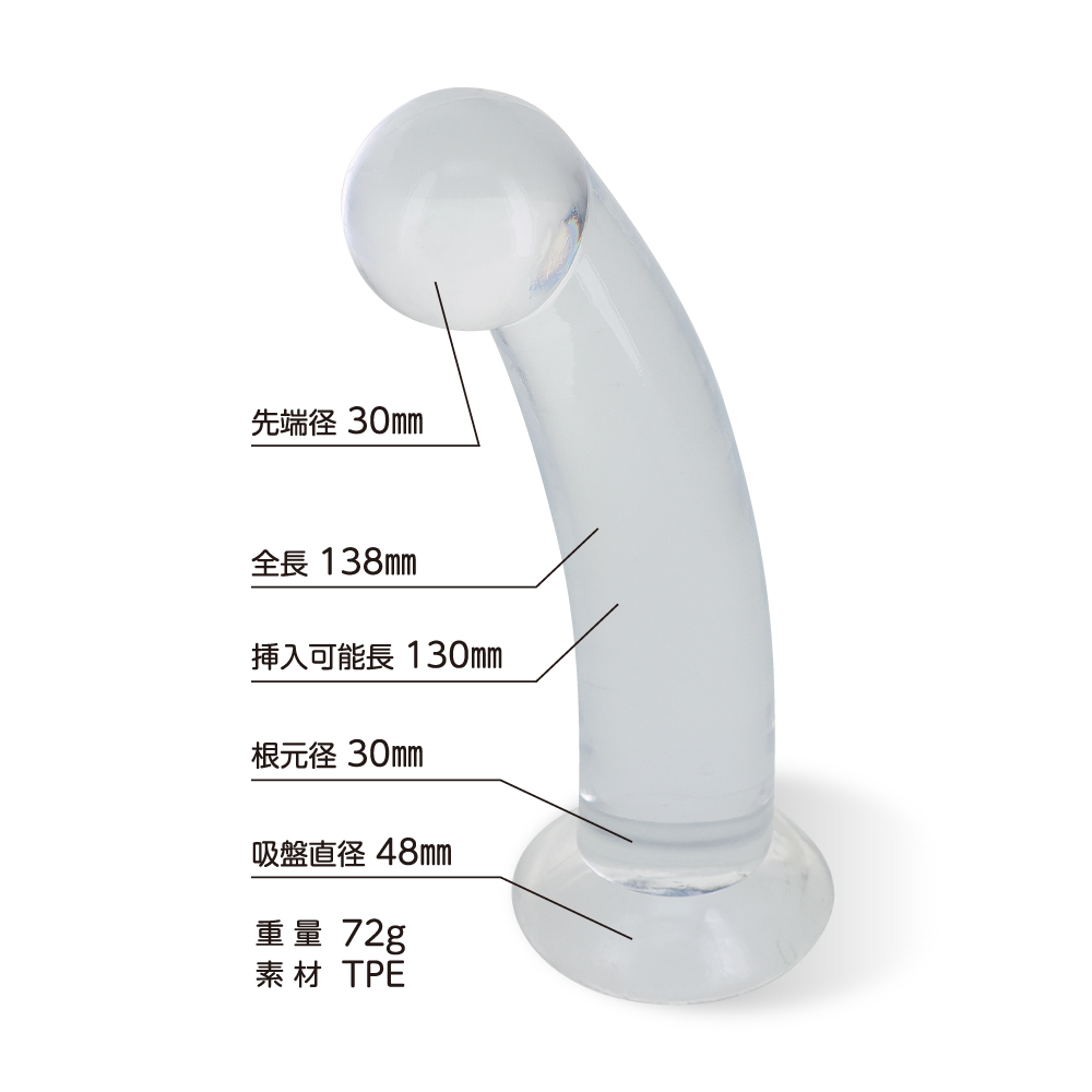 つるんとシンプルに可愛いフォルムに透明度の高い高品質クリアTPE素材を採用しました。とにかく抵抗が少ないスマートで滑らかな形状と透け感が特徴です。もちっと弾力のある感触が程よいリアル感を演出しています。壁や床にしっかり吸着する吸盤付き。