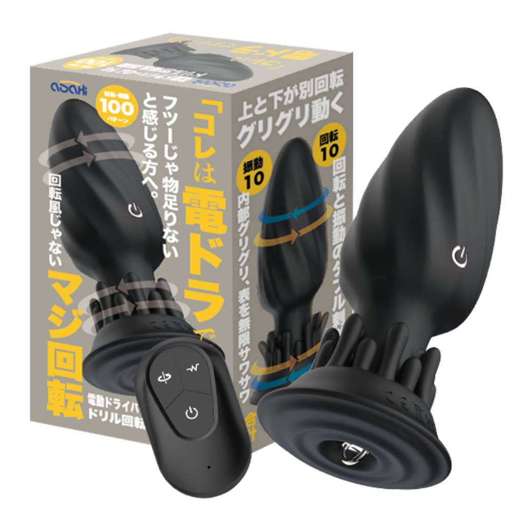 これは電ドラですか!?回転風じゃない!電動ドライバーのようなマジ回転と振動プラグ普通じゃ物足りない方へ!本気ドリルの刺激!!回転風じゃない、電動ドライバーのように右へ左へグリグリ無限回転!中と外で別回転も可能。中のパワフルなグリグリと、外側の優しくなで付けるはけ部分。10種類の振動と、10種類の回転パターンの組み合わせで100パターンの動き。リモコンでの操作も可能。挿入中にパターンの変更もOK。屋外使用にも役立ちます。IPX7の防水性能で丸洗いOK。すべすべなプレミアムシリコンでメンテナンスも楽々。