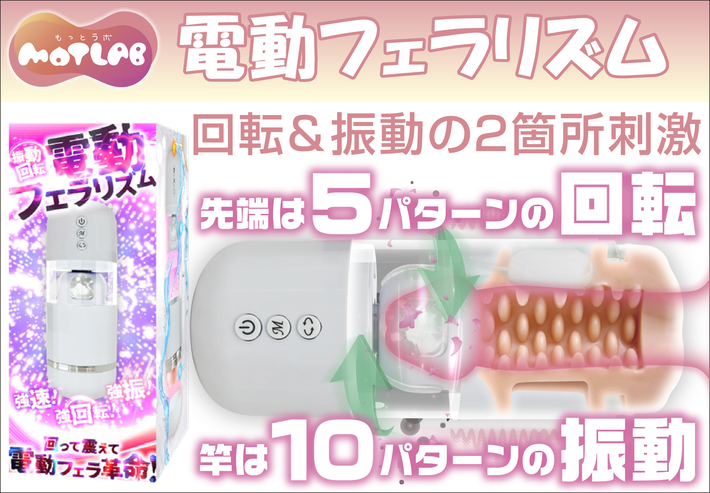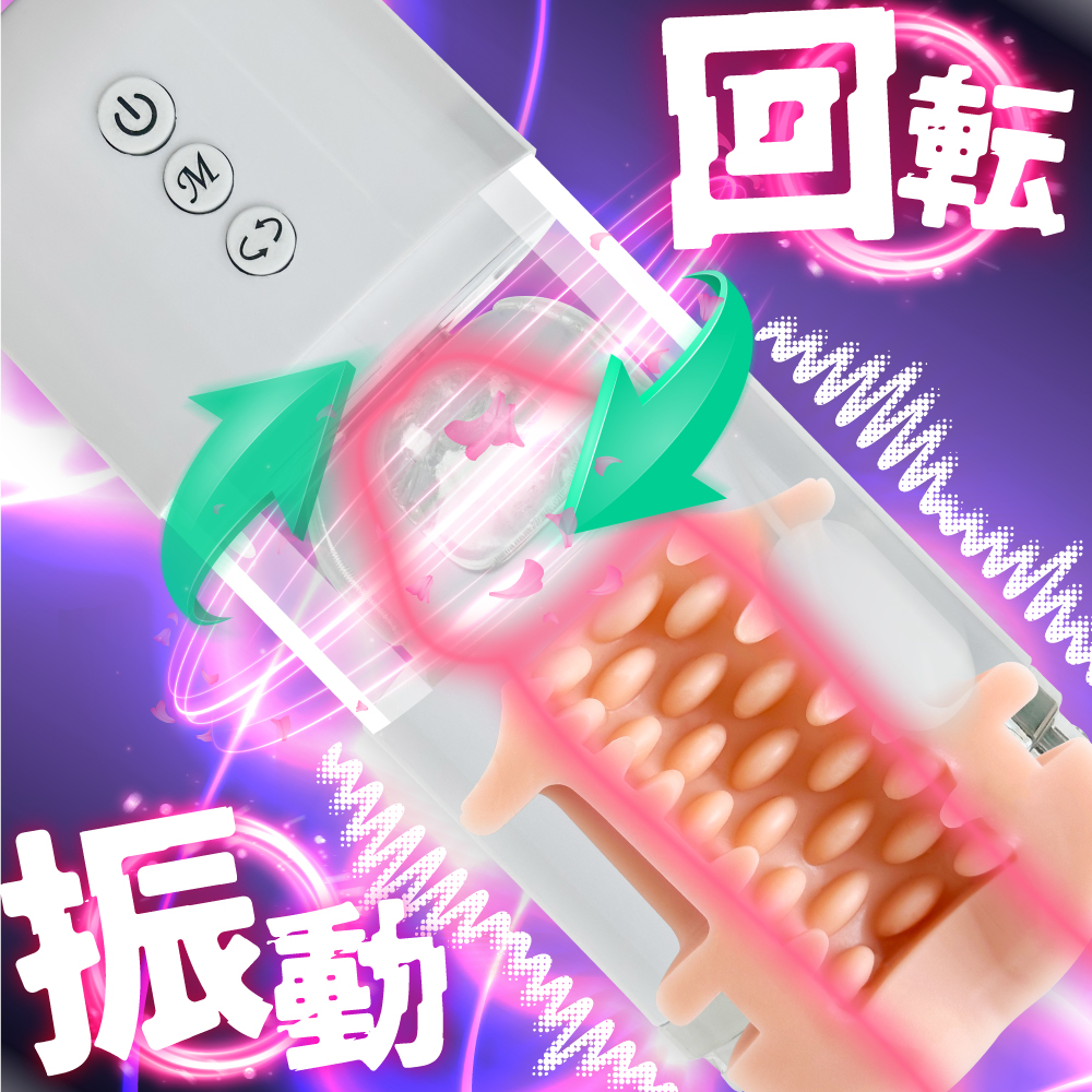 強力バイブと高速回転が生む複合的超快感。2つの快感を1つにまとめた新機軸の電動ホール。振動と回転、2つの独立した動きを兼ね備えた電動ホールです。サ●部分は10パターン切り替え可能な強力バイブレーション機能。先端部分は5パターンの回転が選べるローリング機能を搭載。2箇所の動作をそれぞれコントロールできるので、好みにピッタリな刺激が見つかります。直感的に操作できるシンプルボタンでプレイに集中できます。またパーツごとに分解できるので洗浄しやすく清潔に保てます。