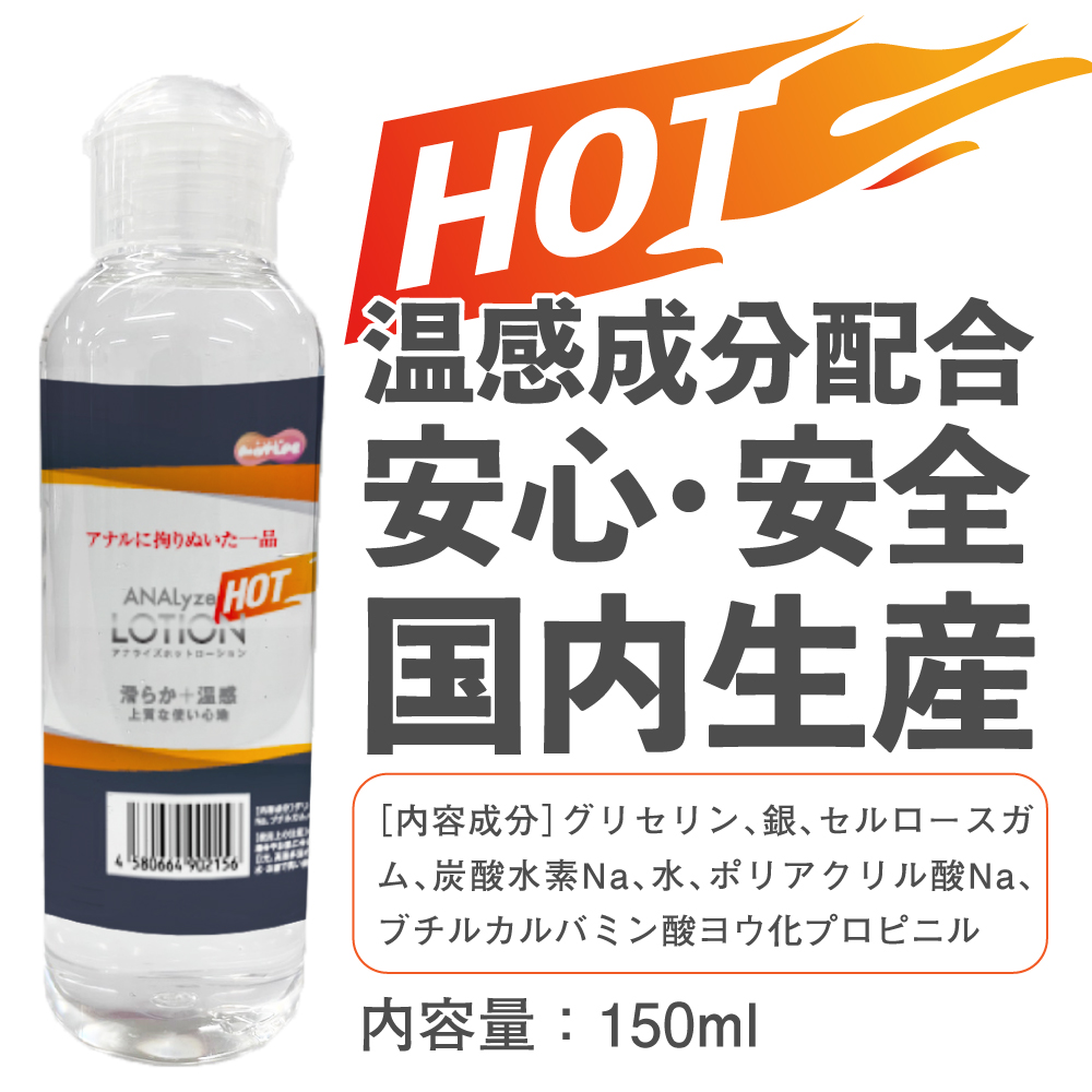 ア〇ルプレイに最適化したホットローション。高い潤滑力で大事な粘膜を保護、じんわり温もり快感UP。ア〇ルプレイに最適化させたホットローションです。高い潤滑力で、摩擦から大事なデリケート部分もなめらかにサポート。塗った瞬間からじんわりと温もりを感じ、普段よりも高い快感を得られます。キャップはワンタッチタイプで使い易く、プレイ時の継ぎ足しも手間がかかりません。容量は使い切りやすい150ml。持ち運びにも便利なサイズです。