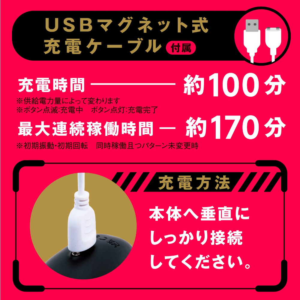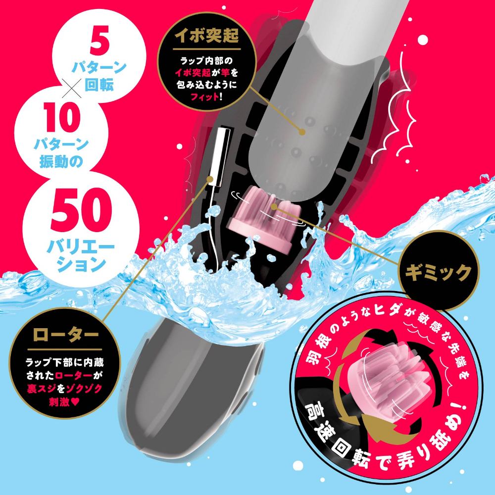 羽根のようなヒダが敏感な先端を高速回転舐めでで弄り責め!!ラップローターにヒダスピンverが登場っ!ラップ内部のイボ突起が竿を包み込むようにフィット♪ラップ下部に内蔵されたローターが裏スジをゾクゾク刺激し、向きを変えればキトーの絶妙快感も楽しめる♪10パターン振動×5パターン回転の全50バリエーションで気分に合わせて快感も変更が可能。肌ざわり滑らかな高品質シリコン仕様&高い伸縮性でいろんなサイズを包み込むようにフィット♪ワンハンドで操作が簡単なだけでなく、もう片方の手で利便性・自由度がUP!一回の充電で長時間楽しめる優れものです。完全防水でお手入れも簡単!※本体:充電時間約100分※本体:最大連続稼働時間約170分(初期回転・振動パターン同時稼働且つ未変更時)_IPX7等級_5パターン回転_10パターン振動_付属品:USBマグネット式充電ケーブル検査番号:2502486