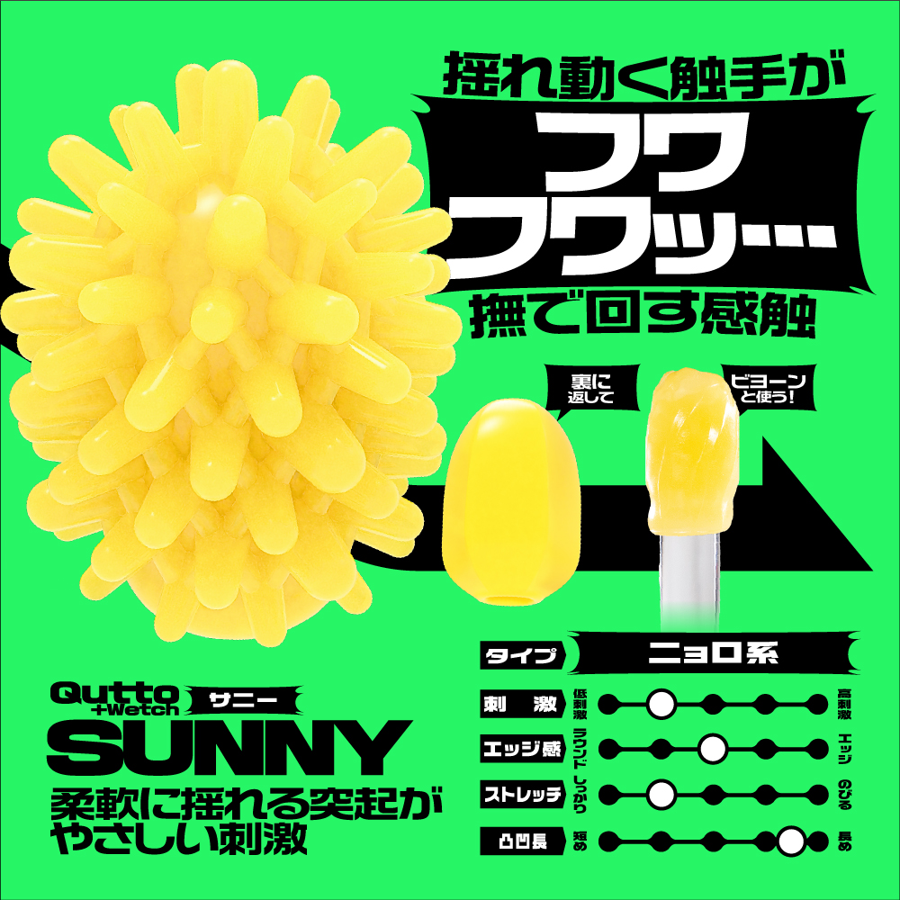 大粒デコボコ刺激がキュット締めつけ!裏返す事で未知なる体験と利便機能を持った変化する密集体ホール。「Qutto-キュット-」は、従来よりも大きく肉厚な突起を搭載。凹凸面を内側に返すことで、大粒の刺激が密集し、キュッと締めつけることで「未確認の触感」を楽しめます。さらに、素材は水と反応してぬめりを生む「プラスウェッチ」に進化。ローションなしで内部の構造をしっかり感じられます。サニータイプは、柔軟に揺れる長い突起が全体を優しくなでつけ刺激。予備用ローションも付属しており、好みに応じて使い分けが可能です。