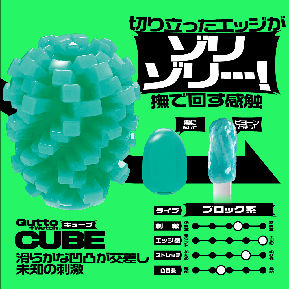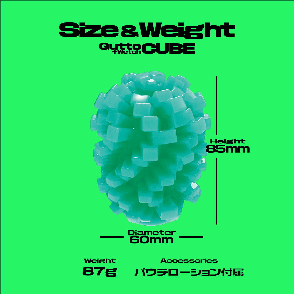 大粒デコボコ刺激がキュット締めつけ!裏返す事で未知なる体験と利便機能を持った変化する密集体ホール。「Qutto-キュット-」は、従来よりも大きく肉厚な突起を搭載。凹凸面を内側に返すことで、大粒の刺激が密集し、キュッと締めつけることで「未確認の触感」を楽しめます。さらに、素材は水と反応してぬめりを生む「プラスウェッチ」に進化。ローションなしで内部の構造をしっかり感じられます。キューブタイプは、螺旋状に並んだキューブが回転で変化し、独特の刺激に。予備用ローションも付属しており、好みに応じて使い分けが可能です。
