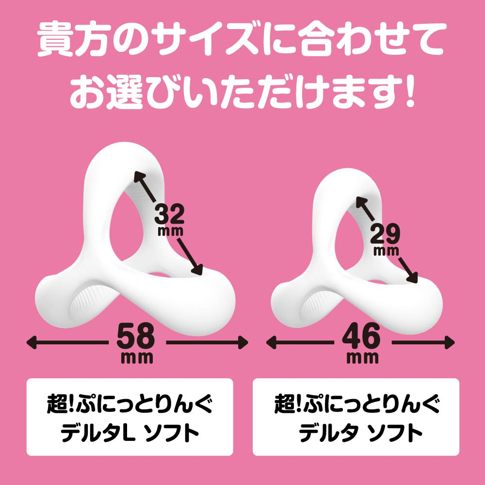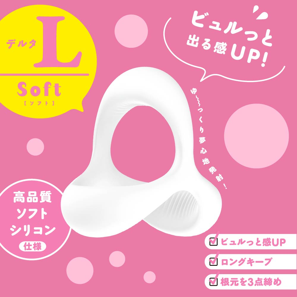 超!ぷにっとりんぐデルタにLサイズが登場!サイズに合わせて選択ができるようになりました。サッと装着♪ピタッと密着!根元を3点締めしてくれるデルタ形状のソフトverです。臭いのない高品質ソフトシリコンで着けてるストレスを軽減!デルタ形状でやさしく締め付け!勃ちの維持!萎え気味の竿の補強!イキ抑制!フィット面に施された滑り止めがズレを軽減し、皮戻り防止にも便利です。ビュルっと出る感UPでゆ~っくり夢心地発射!検査番号:2500422