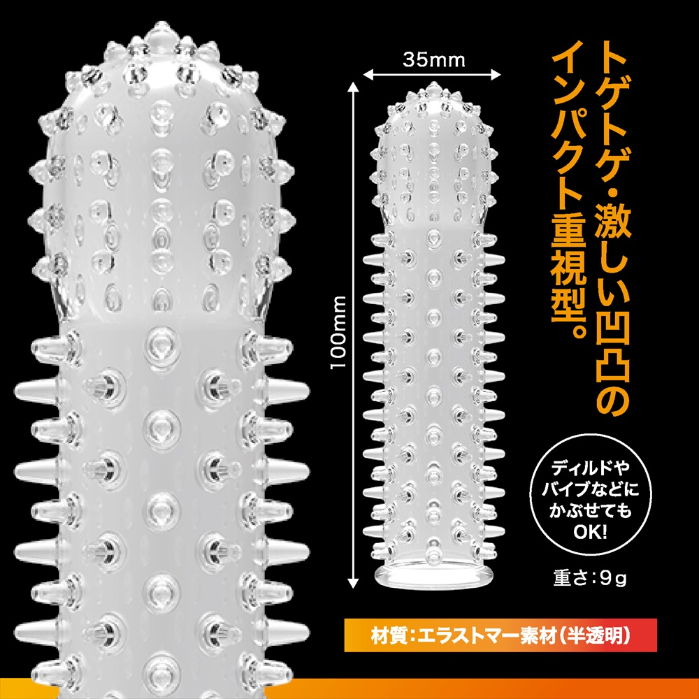 トゲトゲ・激しい凹凸のインパクト重視型サック。伸縮性に優れたエラストマー素材の為、簡単に装着も可能でディルドやバイブ等にかぶせても使用できます。パートナーとのプレイに普段と違う刺激を!