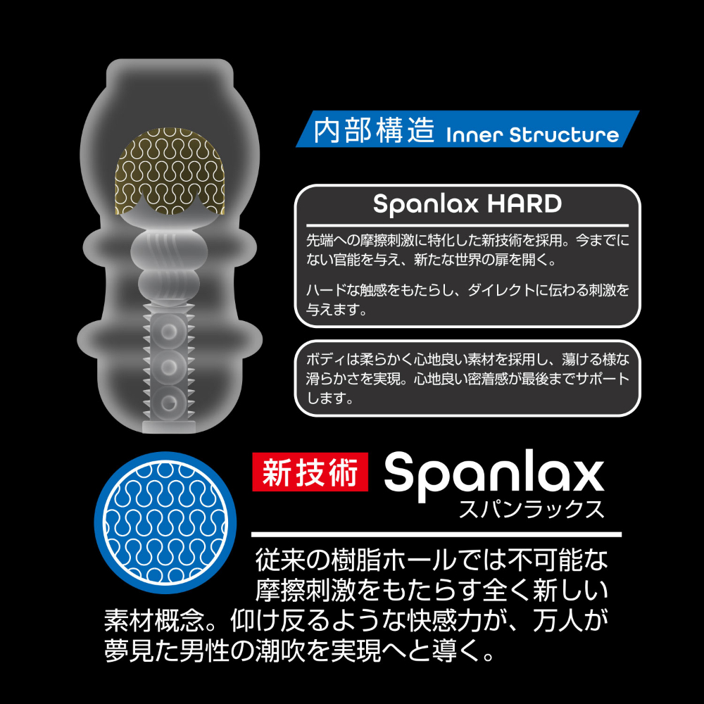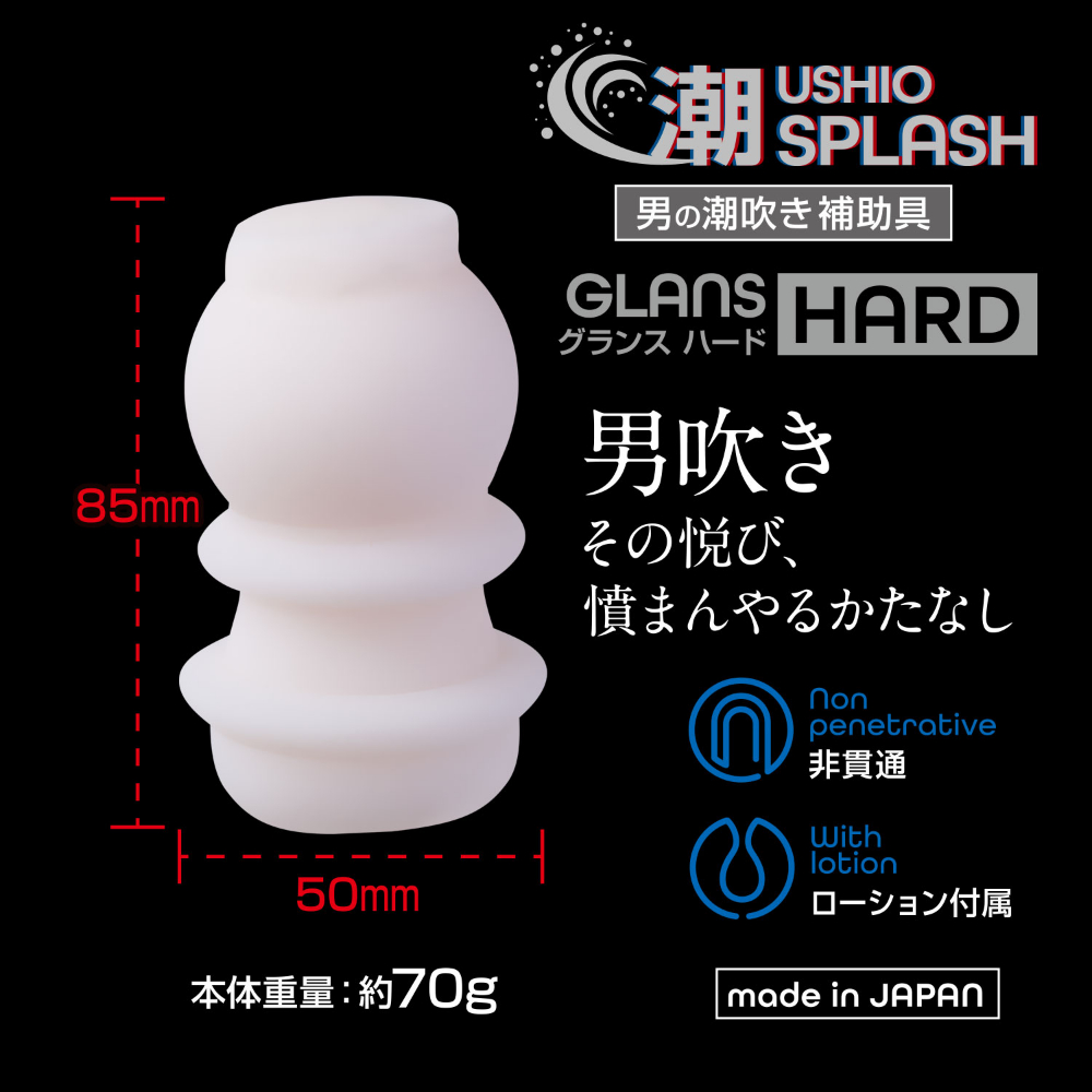 全方位フェチをうたう男性向けブランド「360°FETISH」。今度の商品は未だかつてない「男の潮吹き」に特化した専用モデルです。潮(うしお)SPLASHは新技術Spanlax(スパンラックス)を開発・採用し、従来の樹脂型ホールでは不可能だった摩擦刺激をもたらします。今までのホールにはない素材感で、男の潮吹きをサポートします。GLANSHARDは刺激をダイレクトに感じるパワフルな使用感です。上部を撫で回すように使用することで、先端部分をくまなく刺激します。徐々に昂まる刺激と相まって、「男の潮吹き」への期待感が持てるアイテムになっています。また本品は匂いの少ない素材を使用した純国産です。このホールのために考えられた新素材・KRスキンを採用し、純度の高い快感を提供することが可能になりました。目覚めよ、男たち!!新たな可能性を探求してください。