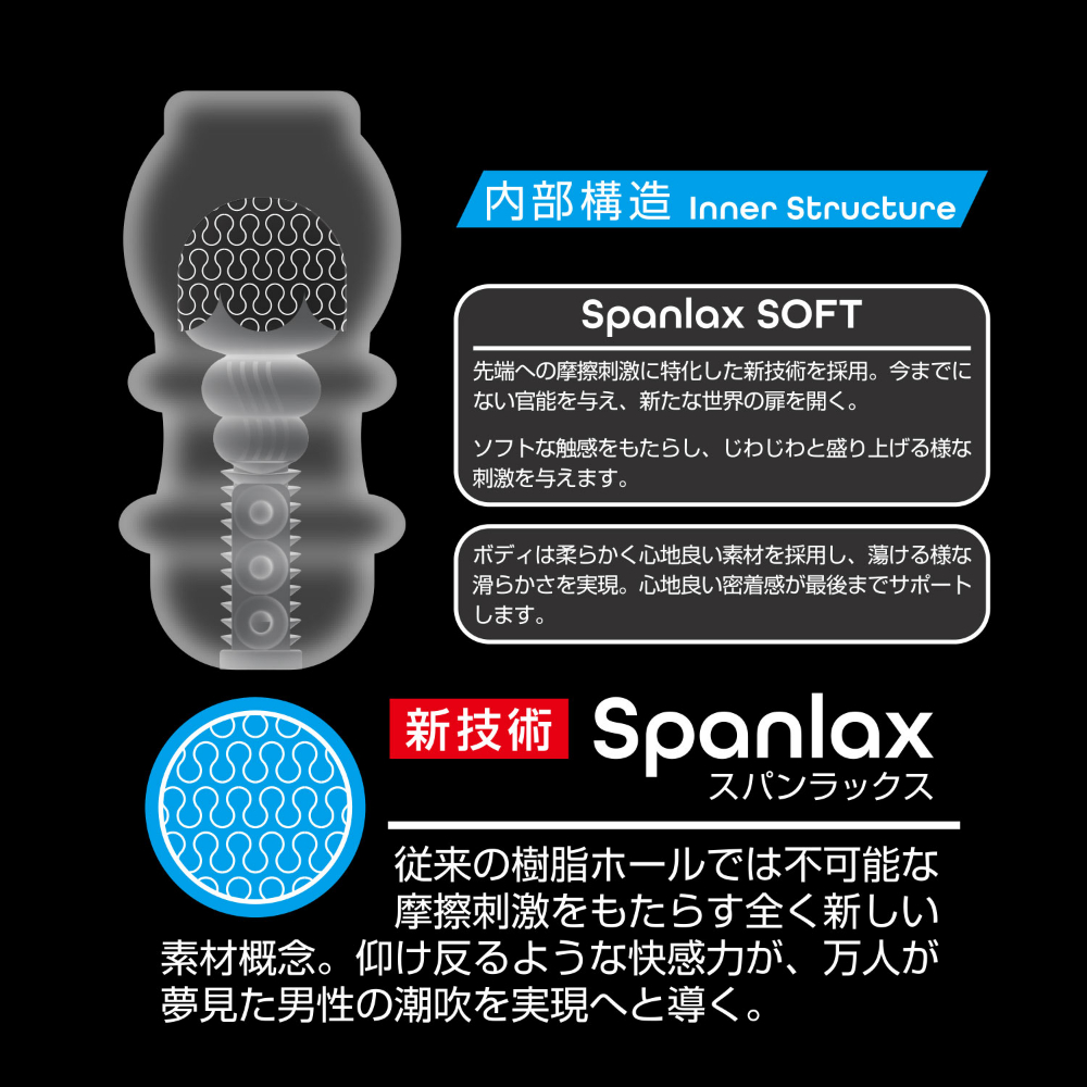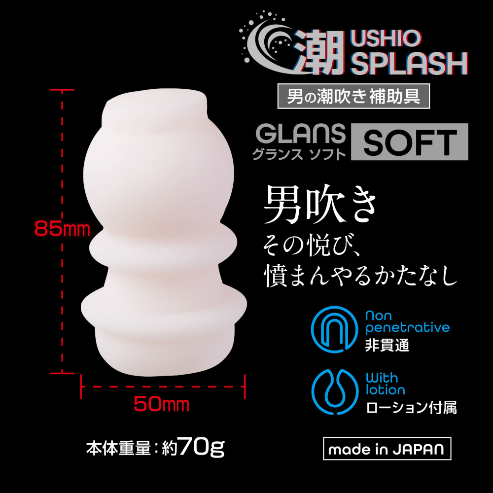 全方位フェチをうたう男性向けブランド「360°FETISH」。今度の商品は未だかつてない「男の潮吹き」に特化した専用モデルです。潮(うしお)SPLASHは新技術Spanlax(スパンラックス)を開発・採用し、従来の樹脂型ホールでは不可能だった摩擦刺激をもたらします。今までのホールにはない素材感で、男の潮吹きをサポートします。GLANSSOFTは優しい刺激をじっくり味わうことができる滑らかな使用感です。上部を撫で回すように使用することで、先端部分をくまなく刺激します。徐々に昂まる刺激と相まって、「男の潮吹き」への期待感が持てるアイテムになっています。また本品は匂いの少ない素材を使用した純国産です。このホールのために考えられた新素材・KRスキンを採用し、純度の高い快感を提供することが可能になりました。イクを超えて、噴け!!新たな可能性を探求してください。