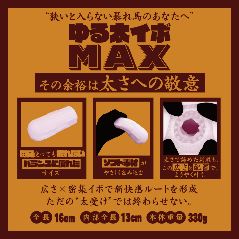 ただ太くてゆるいだけじゃない。包容感と刺激の新境地、それが【ゆる太イボMAX】。内径広めの設計に、大粒&多層イボが贅沢に配置された構造が生み出すのは、ゆるさと刺激の理想的バランス。太めサイズでもしっかり絡みつくように設計されており、特にこれまで太すぎて悩んでいたサイズのユーザーにフィット感を提供。ガバっと包まれ、ゆるっと快感、でも確かに感じる内部の刺激――まさに包容大空間"の名にふさわしい仕様。柔らかめの素材と16cmの使いやすい長さで、初心者から経験者まで納得のクオリティ。たっぷりのローションで包み込まれたい夜に。MADEINJAPANの安心感と共に極上の包まれ体験を。