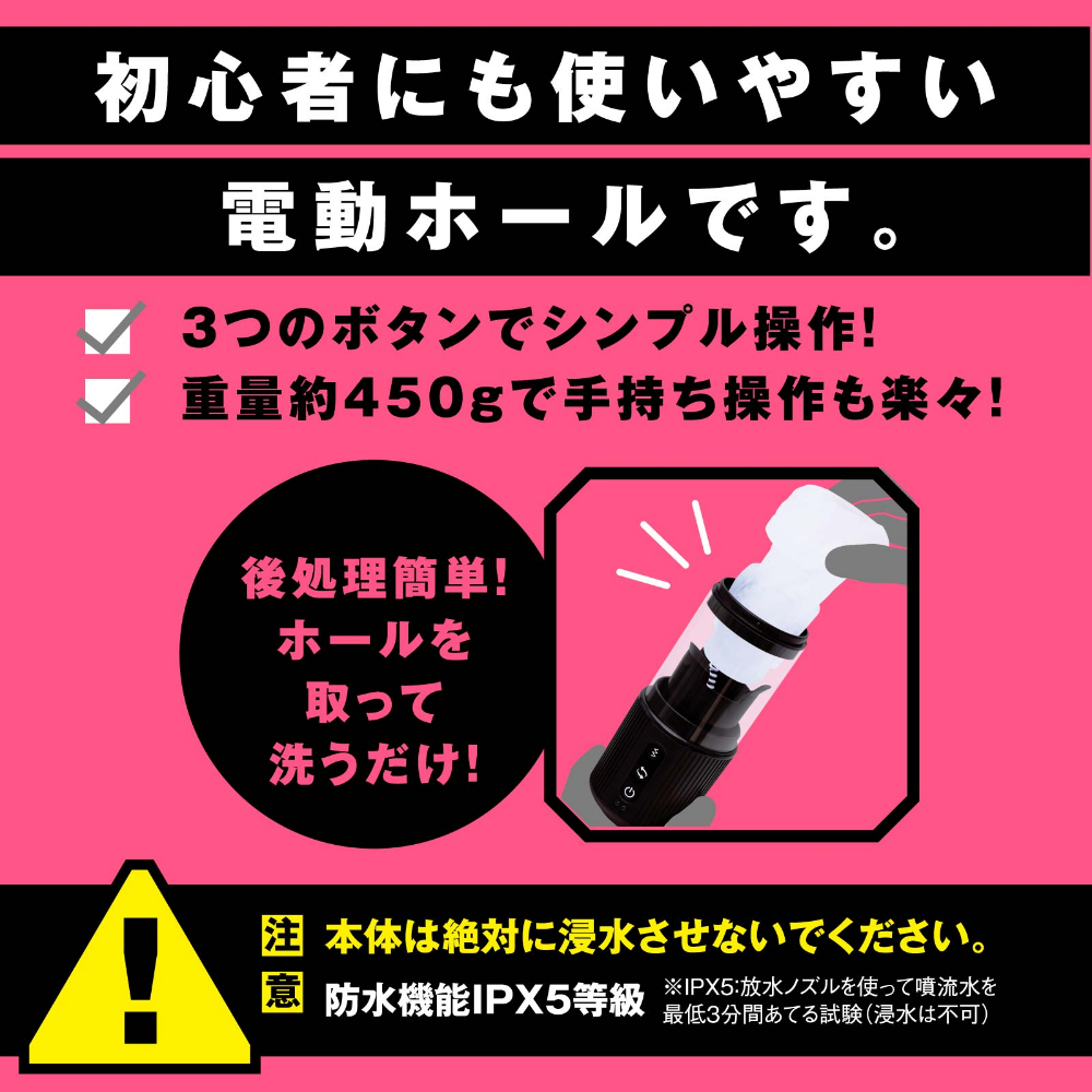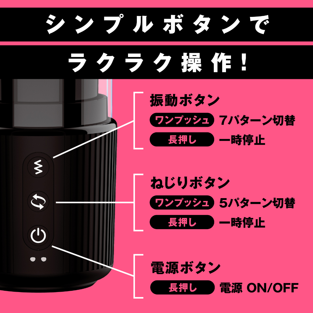 新感覚!ねじり手コキの電動ホール!!ぞうきんしぼりのようにギュギュ〜〜〜ッと締め上げるドS手コキに悶絶!弾力性のある柔らかいホールなので、ねじりでの痛みなどは少なく、程よい刺激のしぼられ快感をお楽しみいただけます。初心者にも使いやすい電動ホールです。3つのボタンでシンプル操作!ホールを取って洗うだけなので後処理簡単!重量約450gで手持ち操作も楽々!高品質エラストマー使用。直接肌に触れるものだから、安全性と感触にこだわっています。【ギュルギュルねじり5パターン】×【芯まで響くヘビー級振動7パターン】。防水機能 IPX5。静音設計 ≦60dB。検査番号:2502700