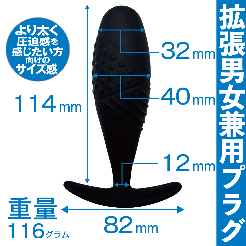 男女兼用拡張用プラグ。拡張することでア〇ルプレイの幅が広がる。ベテラン向けの大型サイズ。ア〇ルを広げてプレイの幅を広げる、拡張用プラグ。最大幅40mmと、拡張ベテランにもおすすめしやすい大型サイズです。長期間挿入して生活することで、徐々に拡張できます。硬すぎないソフトシリコン製で、緩やかなカーブを描いており、スムーズに挿入できて安心。洗浄も簡単なので清潔に使用できます。