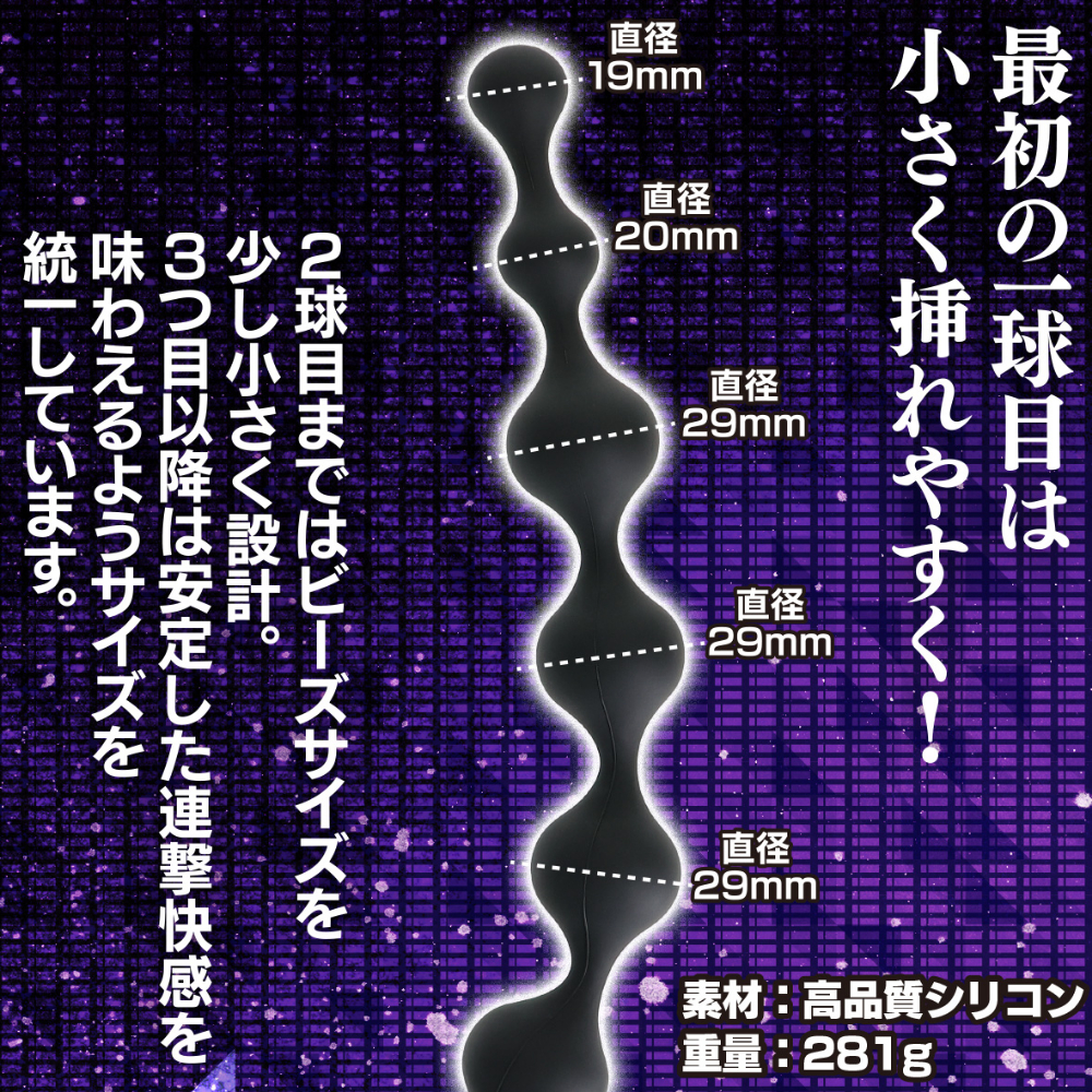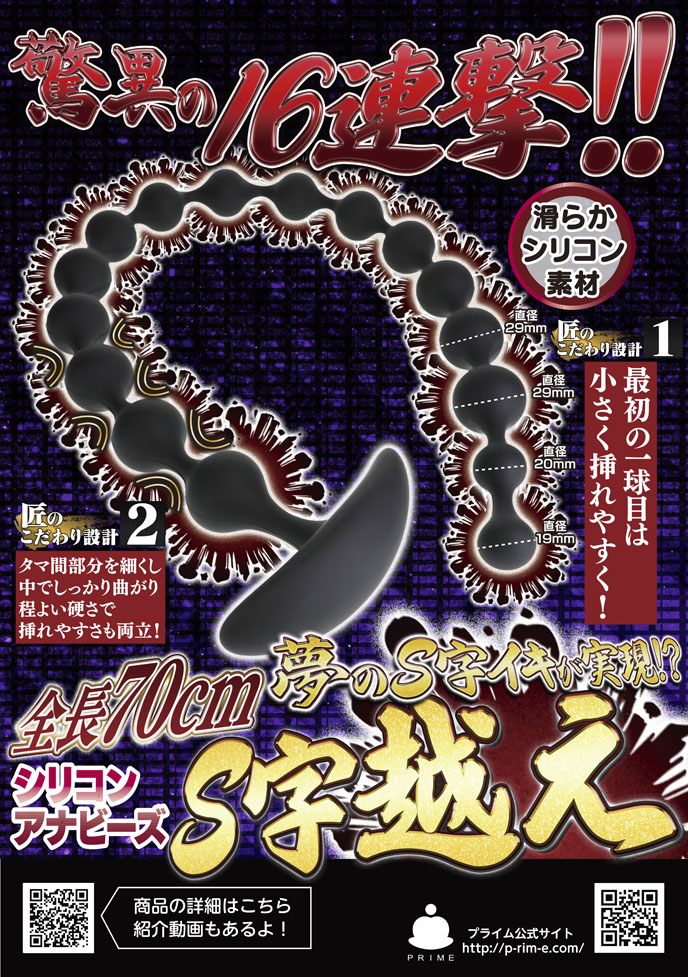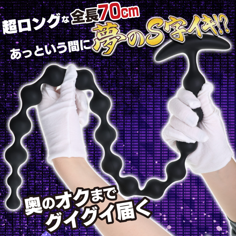 奥の奥を超えた先にある快感を味わえる!夢のS字越えが実現出来る、驚異の全長70cm!球の数はなんと16連撃の超弩級アナビーズ!最初の一球目と二球目は挿入しやすいように少し小さく設計。その後は一番高感度の直径29mmの球がどこまでも連続する快感!球と球の間にはしっかりと細く絞り、緩急を付けています。これにより程よい硬さなのにちゃんと曲がる【程々(ほどほど)】の妙を実現しました。素材はローションのノリも良く、滑らかで安心安全な高品質のシリコン素材採用。ストッパーの役割も担う操りやすい持ち手形状。全てが玄人レベルにこだわったアナビーズです。もちろん、初心者の方でも好きなところまで楽しめる絶妙サイズビーズなので伸びしろを信じてここからスタートも出来ちゃいます!