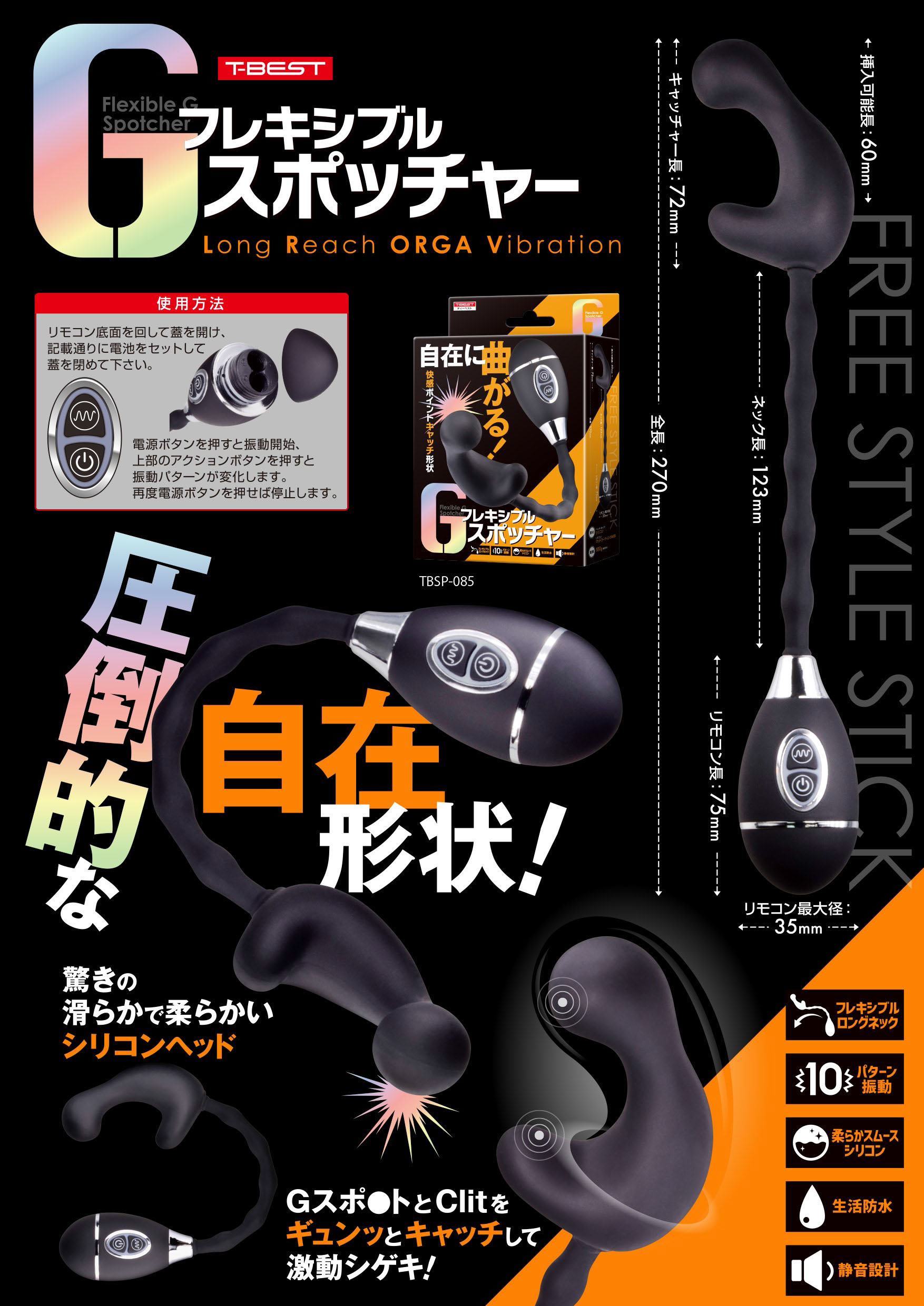 長いネックが自在に曲がって楽しめるフレキシブルネックローター。先端はこだわりのオルガサンドウィッチ形状で快感部分をしっかりキャッチします。高品質シリコン素材採用の先端がGとClitをしっかりダブル刺激。しっかり楽しめる10パターン振動にプレイの邪魔をしない静音設計。生活防水。グイグイ責めれるスティックGローター!