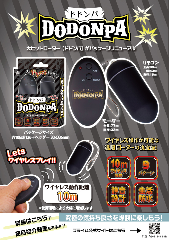ワイヤレスプレイがめっちゃ楽しい大ヒットエスパーローター【ドドンパ】がパッケージリニューアルしました。外責めにも挿入にも適した使い勝手の良い大きめエッグローターにハイパワー振動!10m以上(※)のワイヤレス操作が可能な遠隔ローターの決定版!操作しやすい薄型リモコンには持ち心地の良いマットコーティング加工。実用性・使用感・性能にこだわったドドンなパーティーローター。(※使用環境により大幅に増減します)