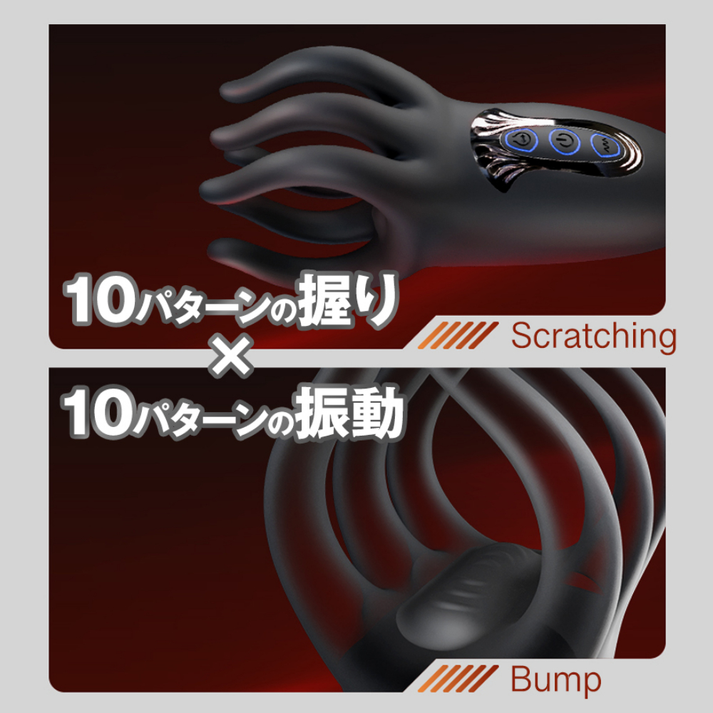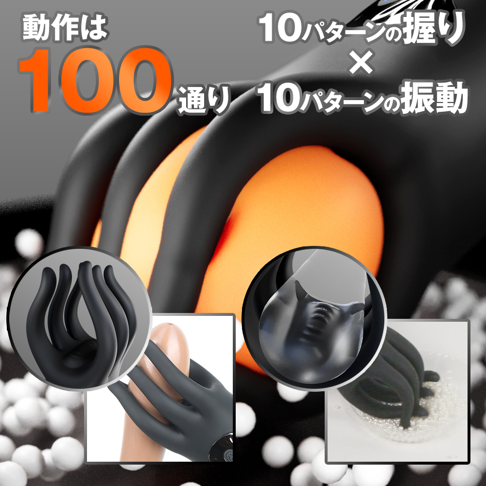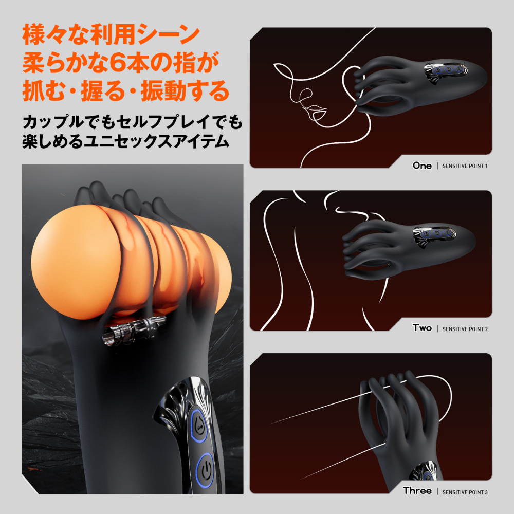 力強い揉み揉み機能と強力振動縦でも横でも楽しめる6本のフィンガーが強振動バイブレーションを伝って力強く揉み揉みしながら躍動します。縦に使ってフィンガーに抓まれる。横に傾けて握られながらスライドして楽しむ。カップルでもセルフプレイでも楽しめるユニセックスプレジャーアイテム。素材は柔らかな医療用高品質シリコンを採用。フィンガーモード10パターン、バイブレーションモード10パターンの全100パターンをお楽しみいただけます。<操作方法>電源ボタン長押し:電源ON/OFFモードボタン短押し:モード切替充電時間:120分可動時間:45分サイズ:150×50×47mm重量:190g
