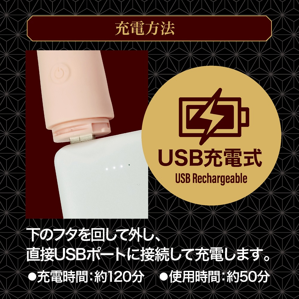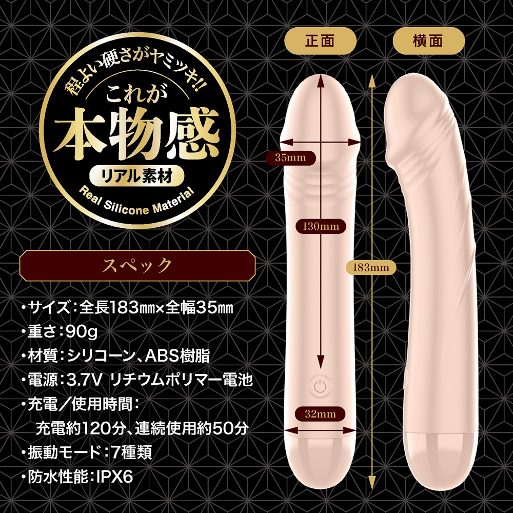 本物を超える悦び、ここに!しっかりとした硬い芯をやさしいシリコンで包んだ特殊構造。7種の振動と防水性能にも優れ、ずぶずぶと遊んで頂けます。本体下部のキャップを開けて直接USBで充電も可能なため煩わしい充電コードも不要。