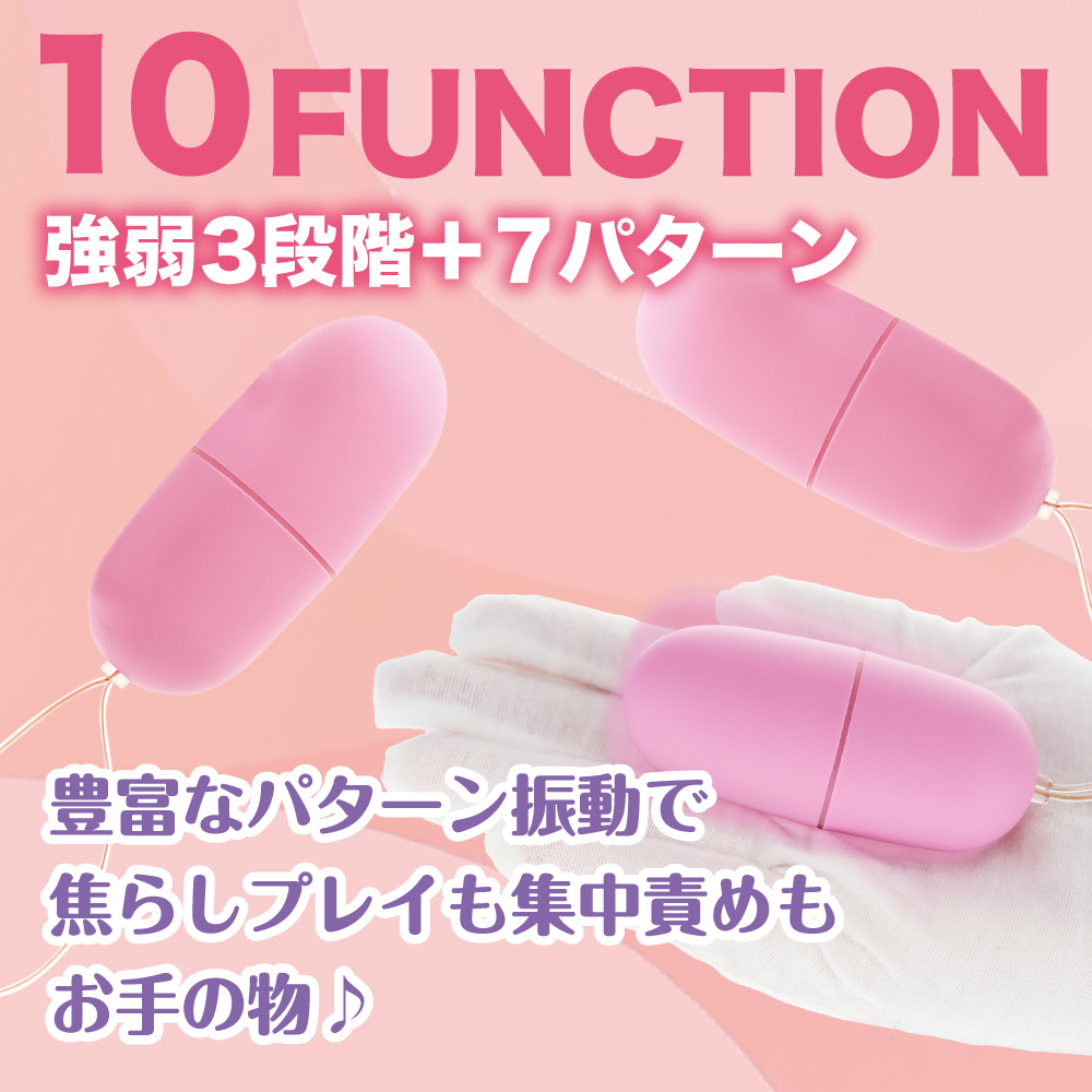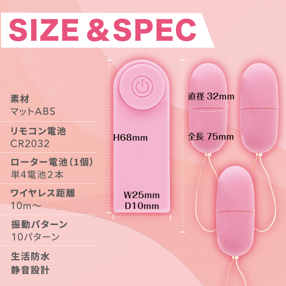 驚異の3個同時操作可能!両乳首とアソコの3点責めが出来る楽しさ3倍以上のワイヤレスローター!リモコンは元祖ピンクローターのコントローラーをオマージュしたシンプルで少しオシャレにリデザインしました。W25xH68mmととってもコンパクトなリモコンはポケットに忍ばせたり手のひらにもすっぽり収まるから、遠隔プレイの幅がグーンと拡がります。可愛いエッグ型ローターはパワフルなミドルモーターを採用。表面はマット加工だから肌触りも滑らかで振動摩擦も低減してくれます。ワイヤレス距離は10m以上だから結構離れていてもしっかりアクション操作が可能です。(使用環境により大幅に増減します)振動パターンも実用性の高い10パターンをプログラム。ワンボタン操作でポケットの中でも押し間違いはありません。