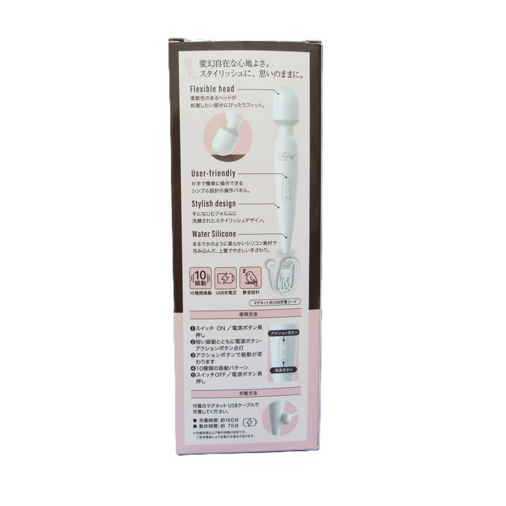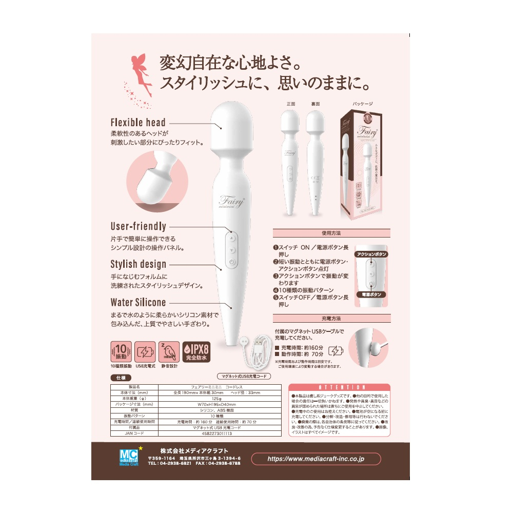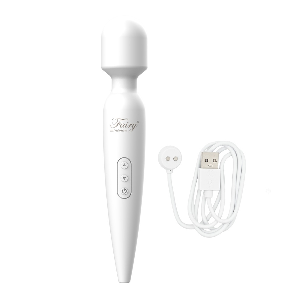 あのFairyminiminiが、コードレスになって登場!!まるでそれは愛らしい妖精、コンパクトで小さいデンマ「フェアリーミニミニ」。全長19センチのスマートサイズに、なめらかなウォーターシリコンスキンをまとったボディ、美しいオフホワイトで統一されたカラーは、妖精(フェアリー)がもつ神秘的な魅力を再現しました。魅せられるようなリラクゼーションで、愛して癒やしてくれることでしょう。もちろん機能も充実。快感を惹きつける強力なハイパワーに、刺激のある振動アクション10パターン、周りが気にならない静音タイプ、ハイグレードな肌触りのウォーターシリコン素材、タフでサスティナブルなUSBバッテリー。防水レベル「完全防水IPX8」。取りまわしやすいヘッド直径33ミリ。小さな妖精でもその輝きは本物、妖精の魔法を楽しみましょう。