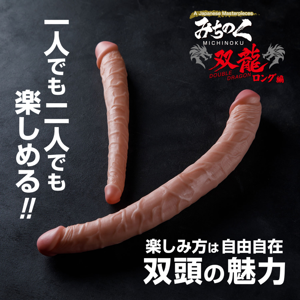 みちのくシリーズより、ダブルで使える双頭ディルドが登場!一人でも二人でも楽しめる、魅惑の快感『みちのく双龍』です。みちのく双龍はダブルヘッド型のディルドです。異なる太さを持つ両端デザインにより、初心者から上級者まで幅広く対応します。細い側はスムーズな挿入をサポートし、太い側ではしっかりとした圧迫感と充実した刺激を体感。好みや気分によって使用する先端を変えるのも良し、パートナーと共有してプレイするも良しと遊び方は自由自在です。ロング編は巨根のダイナミックさと、リアルサイズの絶妙さを堪能することが可能です。また全長370mmと様々なプレイに対応できる十分な長さになっています。単体使用はもちろん、カップルプレイにもおすすめです。みちのくシリーズ同様、やわらかくしなやかな素材で体の動きにフィット。1本で2つの快感を楽しめる万能デザインのディルドです。