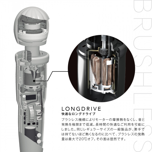 ブラシレス機構によりモーターの摩擦熱をなくし、音と発熱を極限まで低減。
