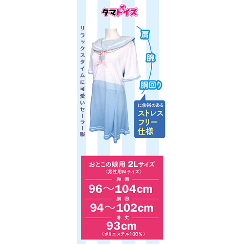 おとこの娘用2Lサイズ 女子●生になった気分を味わえる 肌触り柔らかなパイル地仕様 爽やかな半袖セーラー服タイプ リラックスタイムにかわいいセーラー服 人目を気にせずお部屋でリラックスタイム 締め付けが少なくゆったり着れるワンピースタイプ ふんわりと柔らかいパイル生地使用 肩、腕、胴周りに余裕のあるストレスフリー仕様 ゆったりサイズだから大きな方もOK おとこの娘用2Lサイズ(男性用Mサイズ) 胸囲:96〜104cm 胴囲:94〜102cm 着丈 93cm 品質:ポリエステル100%