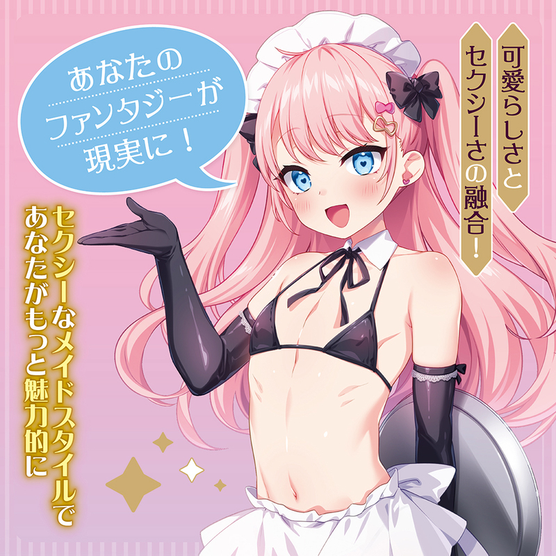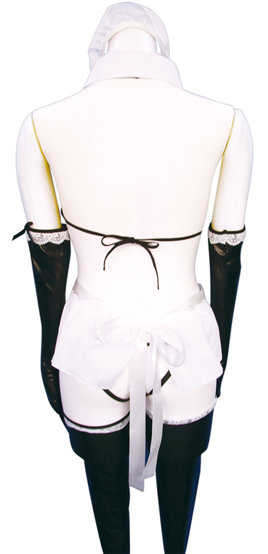 可愛らしさとセクシーさの融合! 光沢感と肌見せがセクシー セクシーなメイドスタイルであなたがもっと魅力的に メイドの可愛さにセクシーをプラス あなたのファンタジーが現実に! 7点セット カチューシャ、首かざり、ビキニブラ、ショーツ、ロンググローブ、ニーソックス、エプロン バスト 79〜93cm ヒップ 87〜105cm Fサイズ ポリエステル90% ポリレウレタン10% イラスト:ぺし太