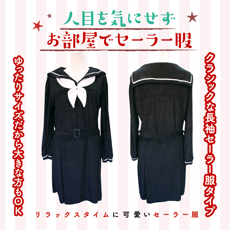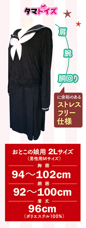 クラシックな長袖セーラー服タイプ 絶対セーラー服が着たいおとこの娘におすすめ! リラックスタイムに可愛いセーラー服 人目を気にせずお部屋でセーラー服 締め付けが少なくゆったり着れるワンピースタイプ やわらか素材で肌触りもgood! ゆったりサイズだから大きな方もOK おとこの娘用2Lサイズ 胸囲:94〜102cm 胴囲:92〜100cm 着丈 96cm 品質:ポリステル100%