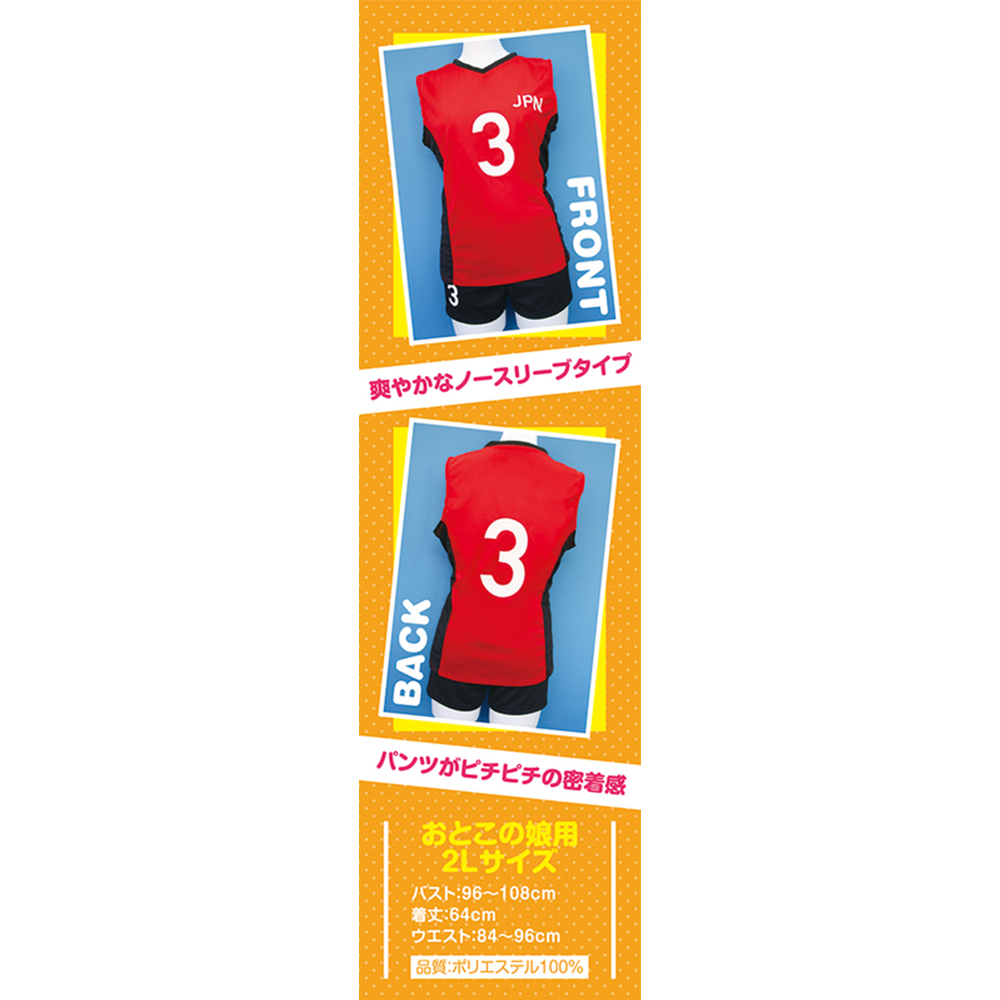 おとこの娘用2Lサイズ 本格的なバレーボールユニフォーム 爽やかなノースリーブタイプ パンツがピチピチの密着感 通気性抜群! 赤と黒のスポーティーなデザイン おとこの娘用2Lサイズ バスト:96〜108cm 着丈:64cm ウエスト:84〜96cm 品質:ポリエステル100%