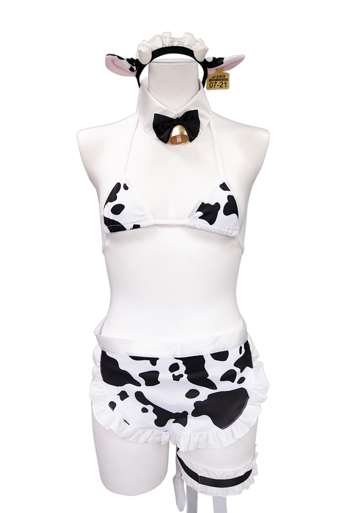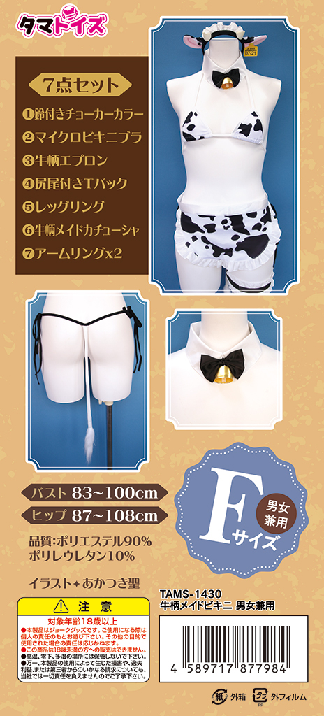 男女兼用Fサイズ メイドの可愛さに牛柄をプラス 牛柄コスチュームで、野生の魅力を解き放て! あなたの中のメス牛が疼きだす 甘くて大胆、牛柄メイドの誘惑 甘さと官能のハーモニー 最高の着心地が体験できる 【7点セット】鈴付きチョーカーカラー / マイクロビキニブラ/ 牛柄エプロン / 尻尾付きTバック / レッグリング / 牛柄メイドカチューシャ /アームリングx2 Fサイズ バスト 83〜100cm ヒップ 87〜108cm 品質:ポリエステル90% ポリウレタン10% イラスト:あかつき聖