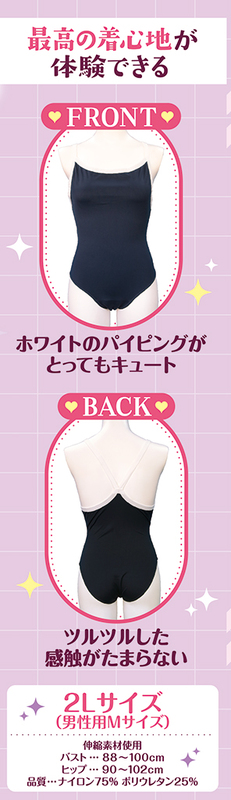 2Lサイズ 股間のワレメカップが綺麗な一本筋を再現 正統派紺色スクール水着タイプ ホワイトのパイピングがとってもキュート ツルツルした感触がたまらない ピチピチのフィット感 最高の着心地が体験できる 伸縮性抜群! 2Lサイズ(男性用Mサイズ) 伸縮素材使用 バスト 88〜100cm ヒップ 90〜102cm 品質:ナイロン75% ポリウレタン25%