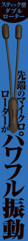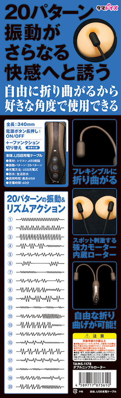 ダブルローターで同時攻略! スティック型ダブルローター フレキシブルに折り曲がる 自由な折り曲げが可能! 両方責めれば快感倍増!! 自由に折り曲がるから好きな角度で使用できる 先端のマイクロローターがパワフル振動 スポット刺激する強力モーター内蔵ローター 20パターン振動がさらなる快感へと誘う 20パターンの振動&リズムアクション 全長:340mm 電源ボタン長押し:ON/OFF +-ファンクション切り替え 静音仕様 ●素材: シリコン,ABS樹脂 ●振動パターン:20パターン ●充電方法: USB充電式 ●防水: 生活防水 ●使用時間:最長60分 ●充電時間:60分 【付属】USB充電ケーブル