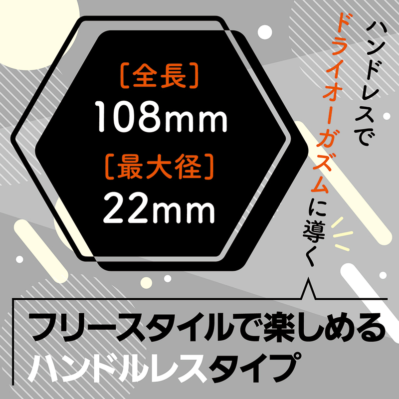高級シリコン素材使用 ハンドレスでドライオーガズムに導く 滑らかなシリコン素材が生み出すソフトな質感 個性的なフォルムが挿入感やフィット感を演出 フリースタイルで楽しめるハンドルレスタイプ 着衣でも使用できる 的確にPスポットを刺激 全長:108mm 最大経:22mm