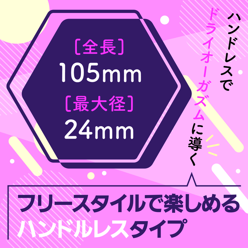 高級シリコン素材使用 ハンドレスでドライオーガズムに導く 滑らかなシリコン素材が生み出すソフトな質感 個性的なフォルムが挿入感やフィット感を演出 フリースタイルで楽しめるハンドルレスタイプ 着衣でも使用できる 的確にPスポットを刺激 全長:105mm 最大経:24mm