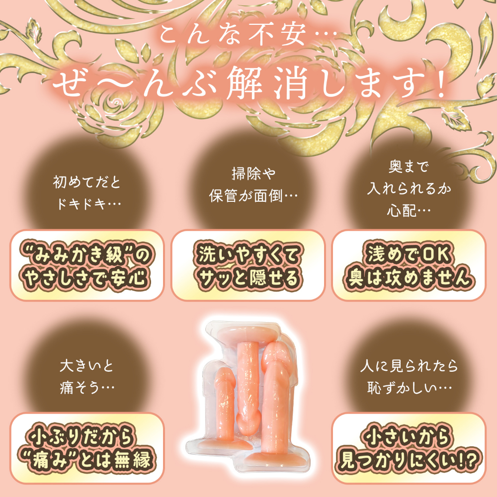 「小さくて、やさしくて、ちょっと神秘的。」女神のみみかき"は、まるで耳かきをそっと差し出すような繊細なやさしさを込めた、ミニサイズの挿入用ディルド。S・XS・XXSの3サイズ展開で、挿入が怖い方や初心者の方にもぴったり。吸盤付きで安定感があり、固すぎず柔らかすぎない絶妙な弾力素材を採用しました。「いきなりじゃなくて…これくらいがちょうどいいの」怖がらなくていい。女神は、あなたの"はじめて"にそっと寄り添います。S全長60mm太さ15mmXS全長50mm太さ12mmXXS全長40mm太さ10mm"