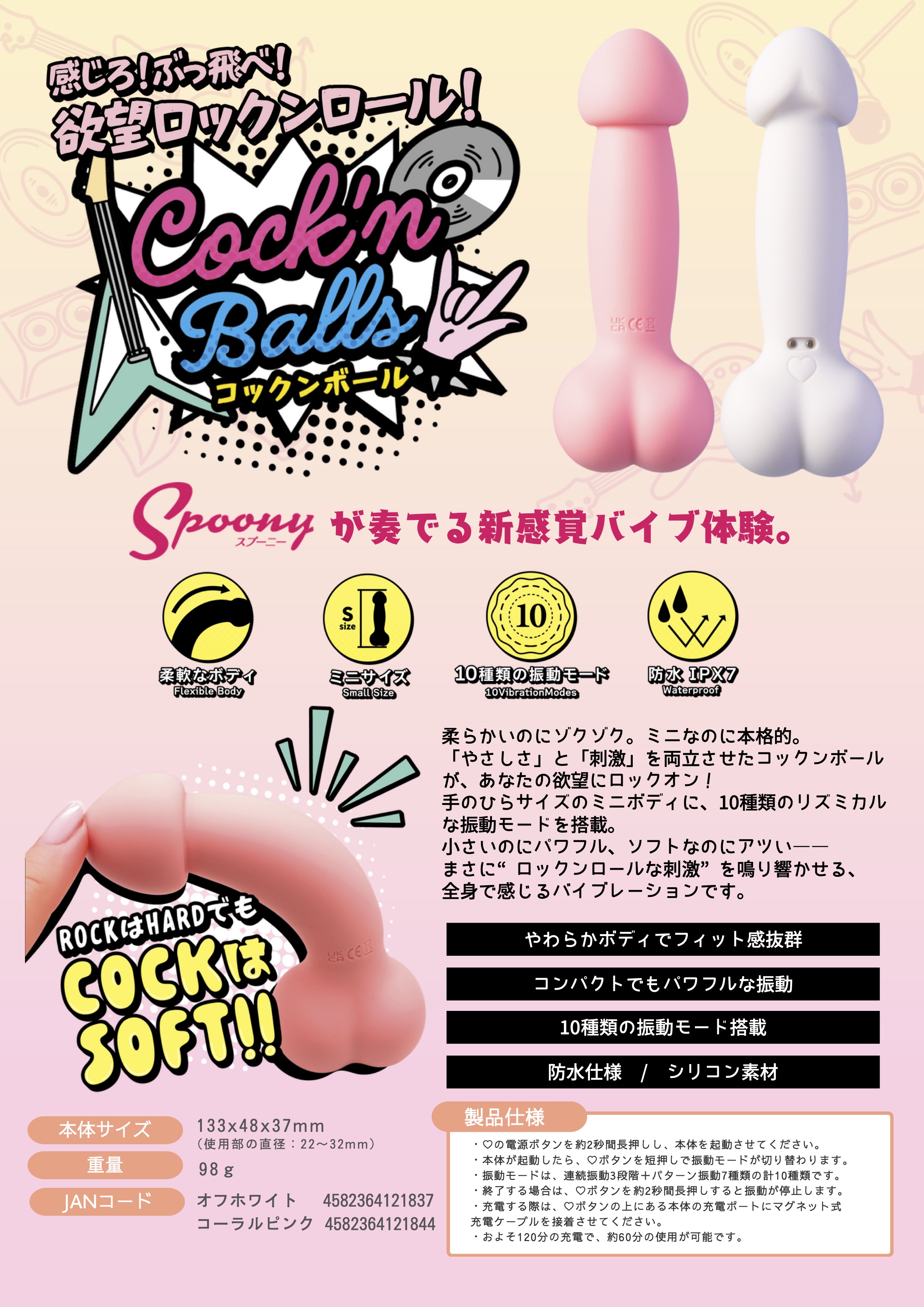 感じろ!ぶっ飛べ!欲望ロックンロール!柔らかいのにゾクゾク。ミニなのに本格的。「やさしさ」と「刺激」を両立させたコックンボールが、あなたの欲望にロックオン!手のひらサイズのミニボディに、10種類のリズミカルな振動モードを搭載。小さいのにパワフル、ソフトなのにアツいまさにロックンロールな刺激"を鳴り響かせる、全身で感じるバイブレーションです。<主な特徴>・やわらかボディでフィット感抜群・コンパクトでもパワフルな振動・10種類の振動モード搭載・防水/シリコン素材"