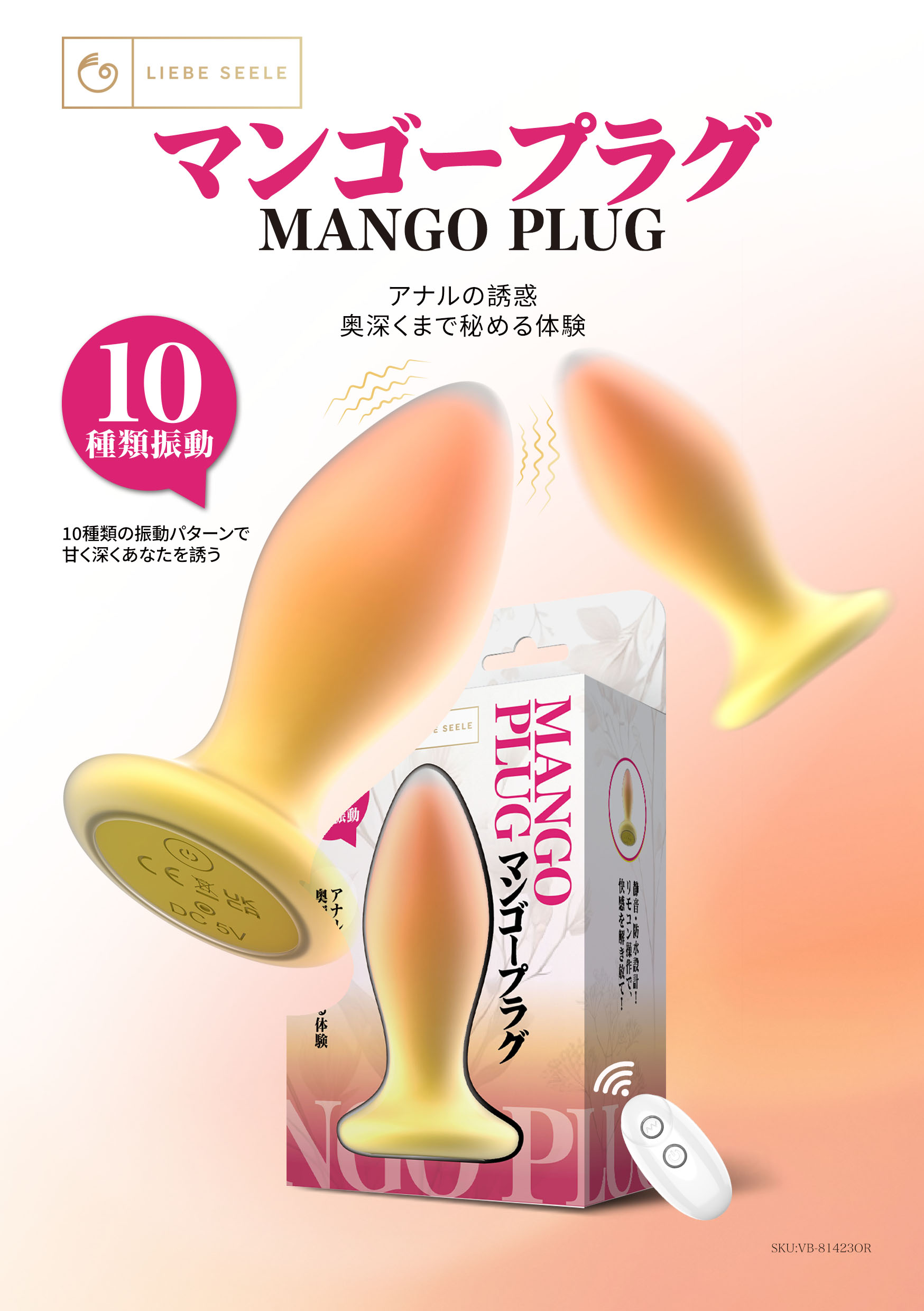 ア●ルにやさしくフィットするなめらかなシルエットと、美しいグラデーションが特徴のバイブレーションプラグ。肌あたりのやさしいシリコン×ABS素材に、10パターンの振動モードを搭載。専用リモコンで手軽に操作可能。USB+マグネット式充電、IPX6相当の防水設計で、バスルームでも安心して使用できます。約60分の充電で最大80分駆動。初心者から上級者まで、後ろの快感"を果実のように熟れさせる、彩り豊かなア●ルアイテムです。"