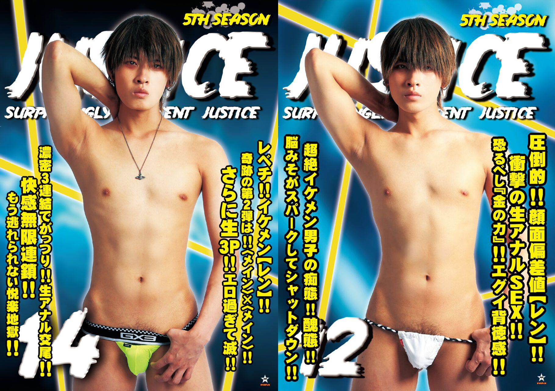 イケメン若雄と淫乱少年のエロ生絡み!!!濃密3P!!!JUSTICE12(5th)メインモデル!20歳!元バスケ部!高身長!ガチノンケ!!【REN】とGUILTYBEST3+1(2nd)メインモデル【HARUMA】!!テカテカツルツルモッコリエロ下着を履いて弄り合う!!熱く交わされるキス!!お互いの舌を吸う!!股間に顔を埋め合う!!上になり下になりチンポをしゃぶり合う!!そこにジャスティスマンが殴り込み!エロビキニの上から2人のアナルを舐めまくる!!両側からチンポを口にねじ込まれる!!チンポをしゃぶりながらしゃぶられる!!肛門にバイブを挿される!!【REN】が【HARUMA】を掘り!【HARUMA】が【REN】を掘る!掘られながらジャスティスマンのチンポをしゃぶる!!3連結でがっつり生アナル交尾!!前も後ろも気持ち良すぎる!!それぞれが掘られながら絶頂射精!!肉団子のようなカオス!!当然生中出し!!深みにハマっていく【REN】!!快感無限連鎖!!もう逃れられない悦楽地獄!!