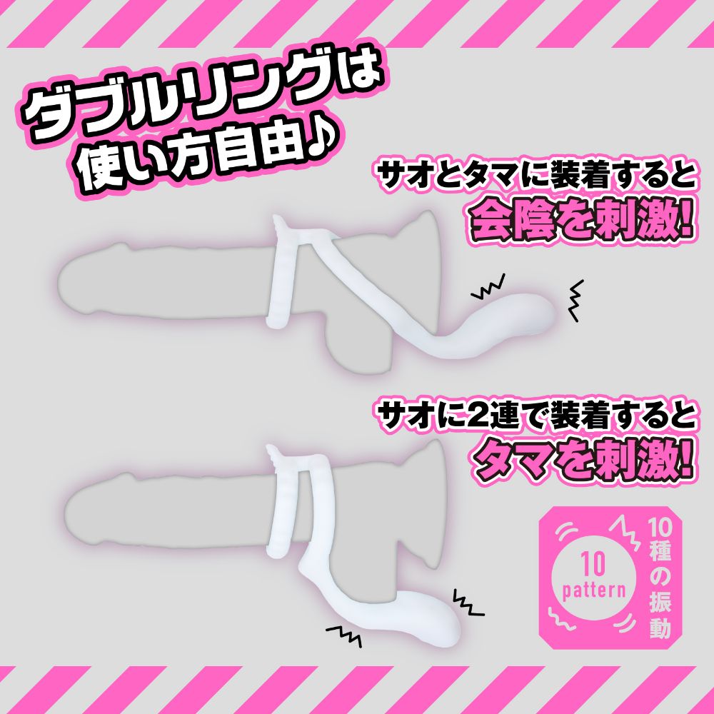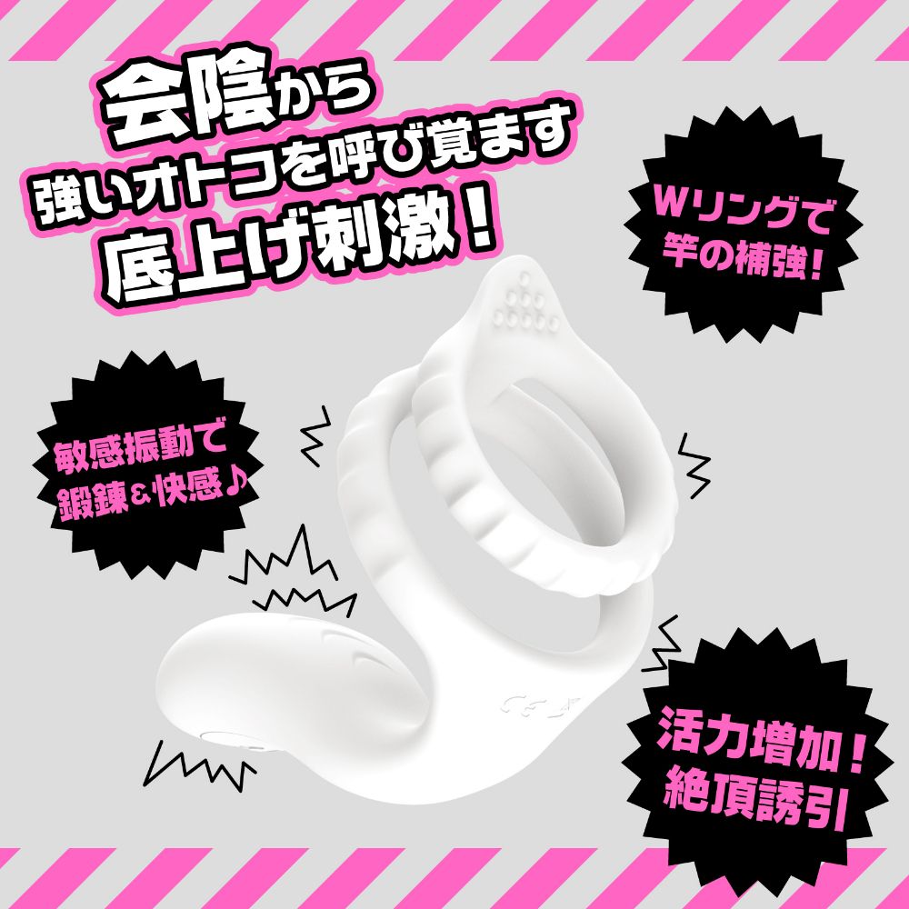 敏感振動で鍛錬&快感♪会陰部に振動モーターがフィットし強いオトコを呼び覚ます底上げ刺激!更に10種の振動パターンをリモコン操作して絶頂タイミングをコントロール可能。高品質ソフトシリコンのダブルリングが竿をやさしく固定し根元の圧迫で活力をサポート!2連で装着しても、竿と袋に装着しても使い方自由。ビュルっと出る感UPでゆ~っくり夢心地発射♪本体は充電式なのでエコに使用可能。※本体:充電時間約60分※本体:最大連続可動時間約80分(初期振動パターン未変更時)_IPX6等級_10パターン振動_付属品:電池式リモコン、USBフォーンプラグ式充電ケーブル※IPX6:放水ノズルを使って噴流水を最低3分間あてる試験(浸水は不可となります)検査番号:2600264