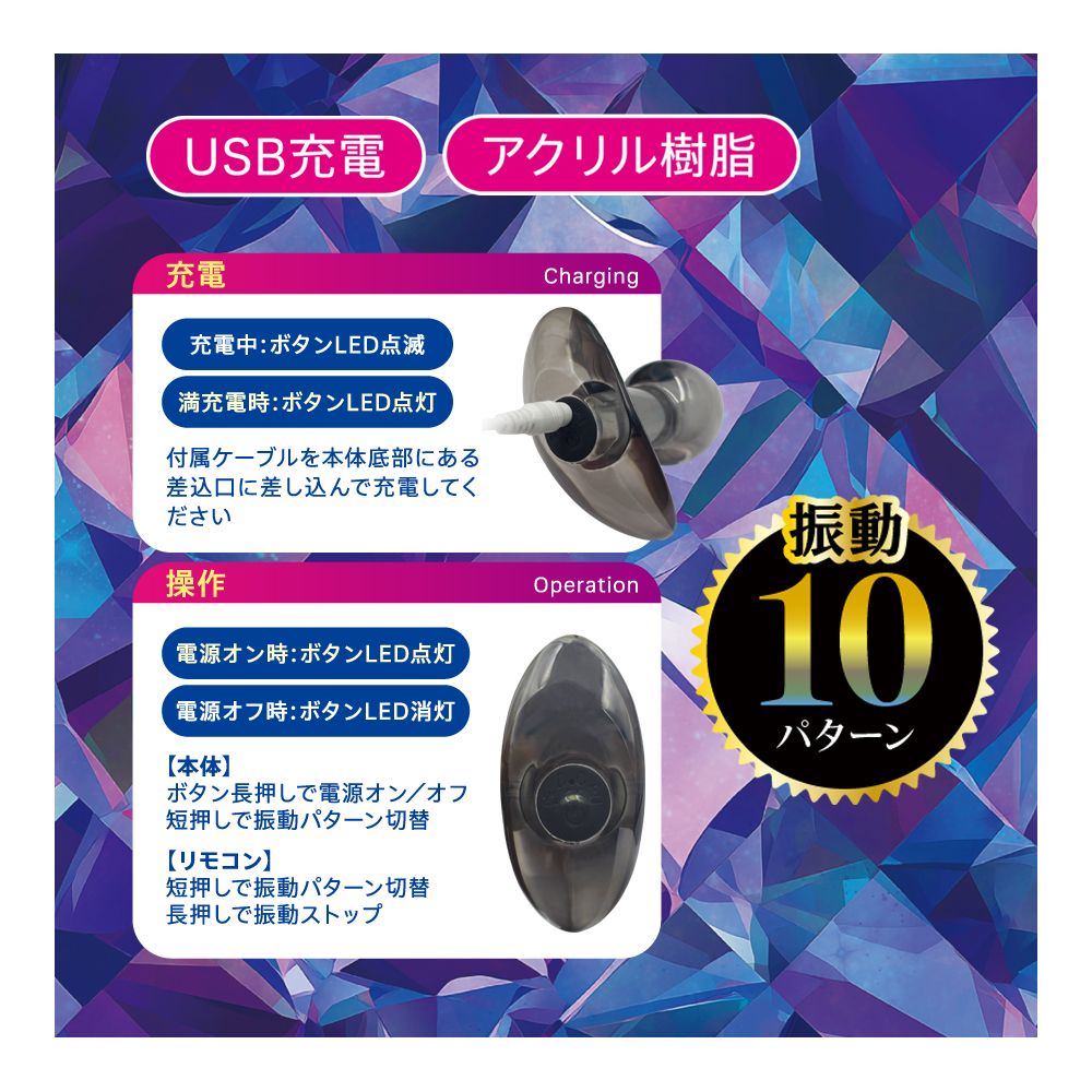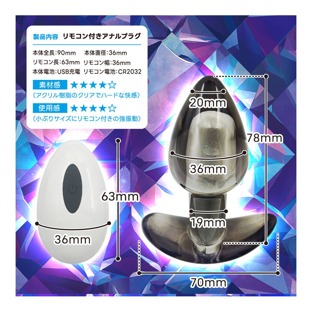 透明感が美しい、まるでクリスタルのように輝くア●ルプラグが新登場! キレイに透き通りながらも、軽くて丈夫なアクリル樹脂製だから、取り扱いは簡単。ツルツルとした表面なので汚れに強く、ア●ルプレイにはピッタリ。さらにカチカチ硬め素材なので、振動がしっかり伝わり、ハードな刺激もばっちり楽しめます。もちろん素材だけでなく、機能も充実です。離れた距離はもちろん、プレイ中でも手元で操作できるリモコン付き。飽きのこない振動アクション10パターン。ビギナーも嬉しい直径36ミリの小ぶりサイズ。お●りにフィットする底面アンカー(錨)タイプ。シックで高級感のあるスモークカラー。美しいア●ルプラグで、悶絶快感をお楽しみください!