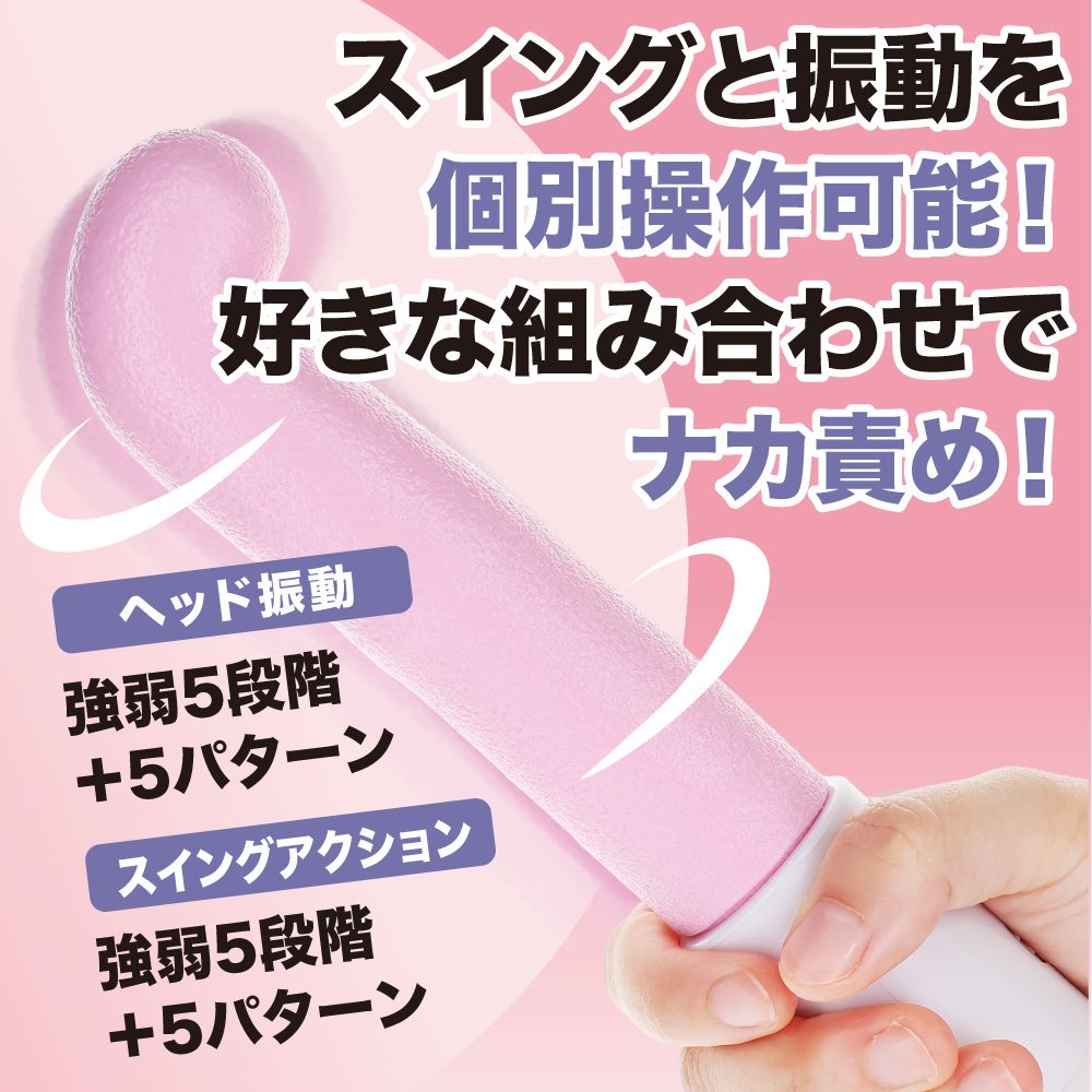 挿れやすいのに満たされる。85度のカーブヘッドが実現したスルッと入って気持ち良いところにピタッと当たる満足感!エラストマー素材に先端振動とスイング機能というシンプルな機構で少し柔らかめの素材の表面に、ローションのノリが良いザラザラテクスチャーを採用。先端は大胆に曲げて、太くないのに満たされ感を味わえます。挿れやすいスマートヘッド形状の挿入感が段違い!6Vのパワフルパワーで強力なスイング振動が楽しめます。抵抗感を軽減したスマートデザインに実用性を詰め込んだバイブレーターです。