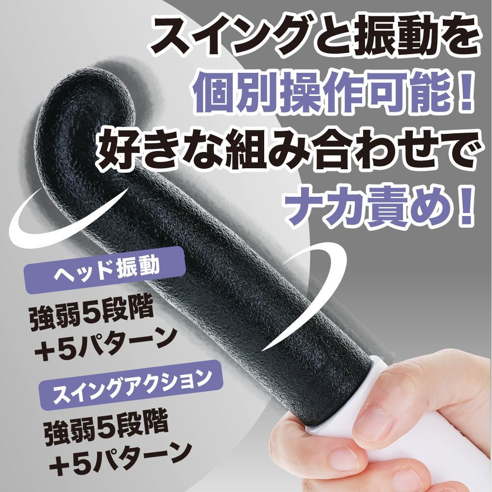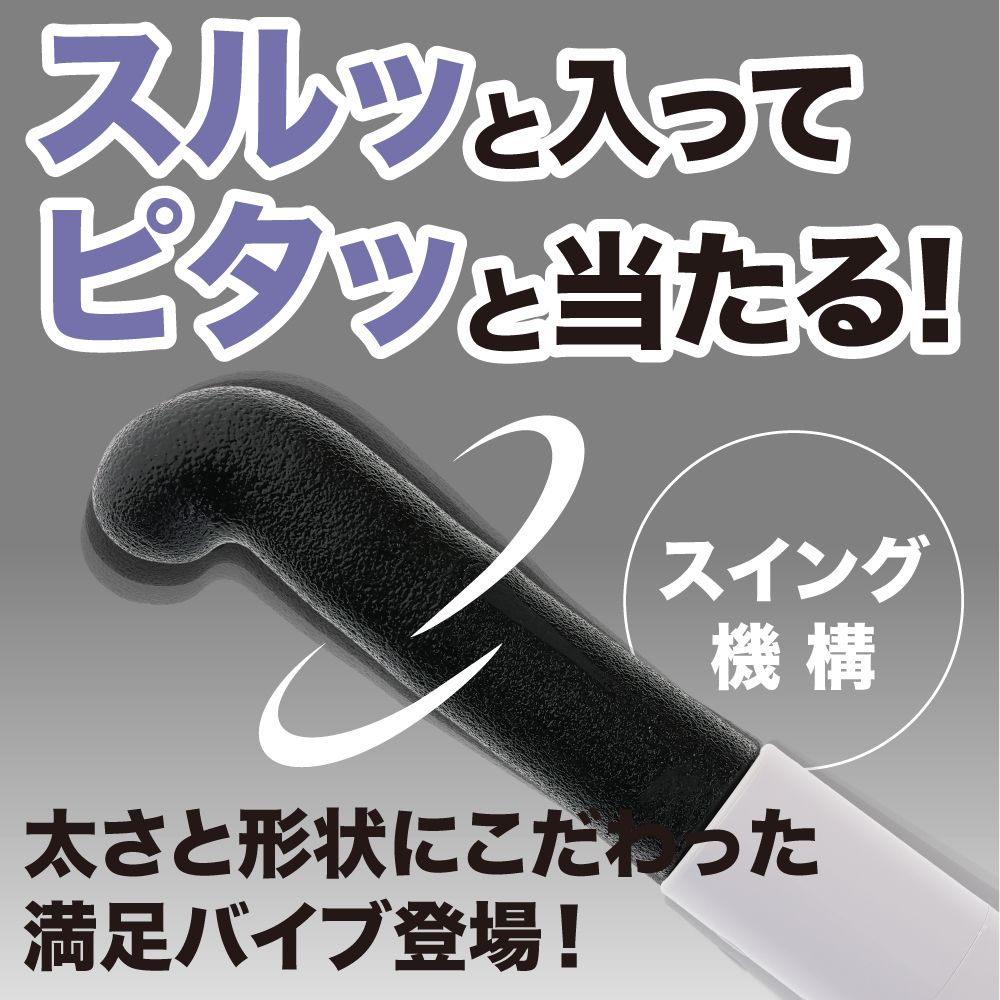 挿れやすいのに満たされる。85度のカーブヘッドが実現したスルッと入って気持ち良いところにピタッと当たる満足感!エラストマー素材に先端振動とスイング機能というシンプルな機構で少し柔らかめの素材の表面に、ローションのノリが良いザラザラテクスチャーを採用。先端は大胆に曲げて、太くないのに満たされ感を味わえます。挿れやすいスマートヘッド形状の挿入感が段違い!6Vのパワフルパワーで強力なスイング振動が楽しめます。抵抗感を軽減したスマートデザインに実用性を詰め込んだバイブレーターです。