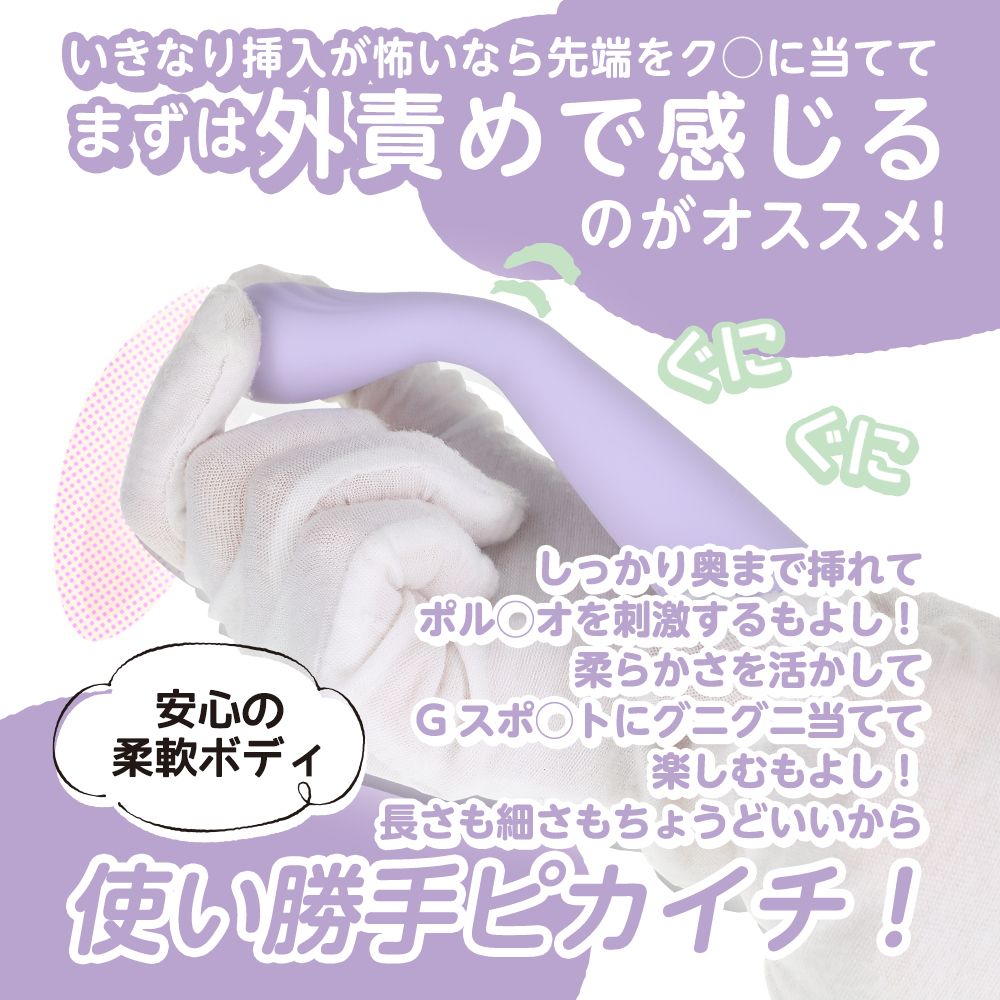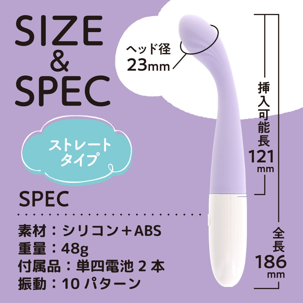 直径23mmのスマートヘッドだから簡単に入っちゃう。そのままGをピンポイント刺激出来ちゃうお手軽バイブ!肌触りが良く滑らかなシリコン素材だから挿れるのに抵抗のある方でも使って頂きやすいスマートでシルキーな入れ心地が特徴です。もちろんピンポイントヘッドでソト責めを楽しんでもOK!ソト責めからの挿入体験も簡単に出来るみんなに嬉しいバイブスティックです。10パターンの心地良い振動と柔らかネックで何から何まで優しさに包まれてる普段使いしやすいアイテム。電源も単四電池2本だから手軽に楽しんで頂けます。