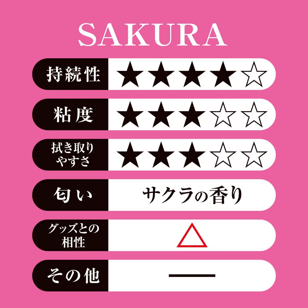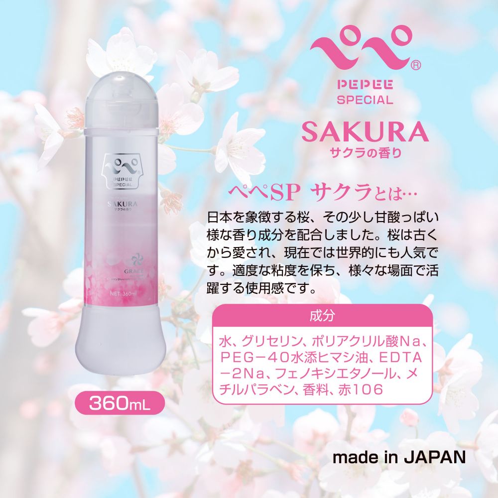 世界中で人気のぺぺSPシリーズ。日本を感じる和"の香りを詰め込んだローションが新登場です。このぺぺSPサクラは「一瞬の美」や「特別な時間」を連想させる、日本人にとって特別な香りです。桜の香りは海外でも「日本」を象徴する香りとして知られており、伝統的な香りとして人気を博しています。強すぎないほんのりとした甘さが特徴で、上品でやわらかい印象です。どこかノスタルジックで、ほんの少しの切なさも演出できるでしょう。粘度は人気の高い中粘度、しっかりとした使用感を感じさせてくれます。持続性もあり、男女の営みにもフィットします。日本国内の工場で生産された安心の品質。ぜひお試しください。"