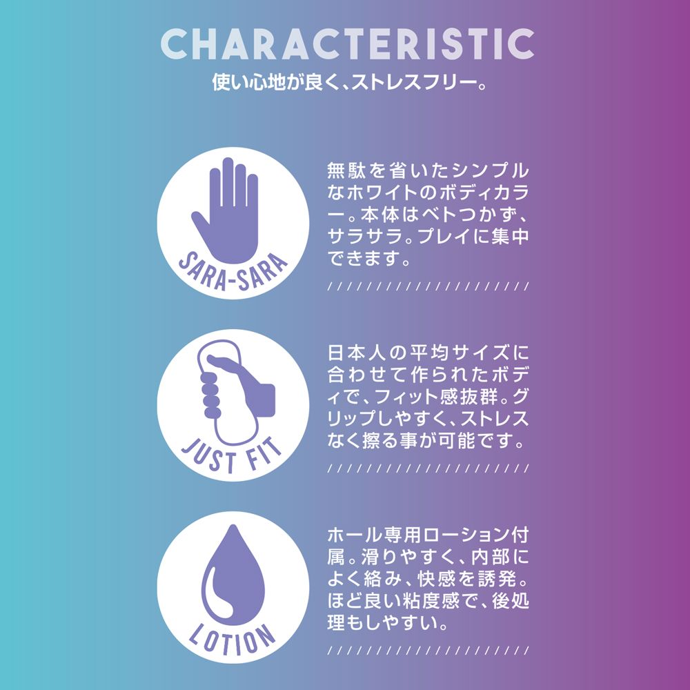 ・ホール専用ローション付属。滑りやすく、内部によく絡み、快感を誘発。ほど良い粘度感で、後処理もしやすい。