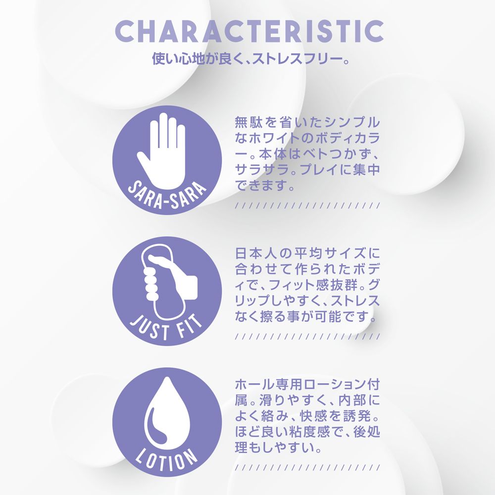 ・ホール専用ローション付属。滑りやすく、内部によく絡み、快感を誘発。ほど良い粘度感で、後処理もしやすい。